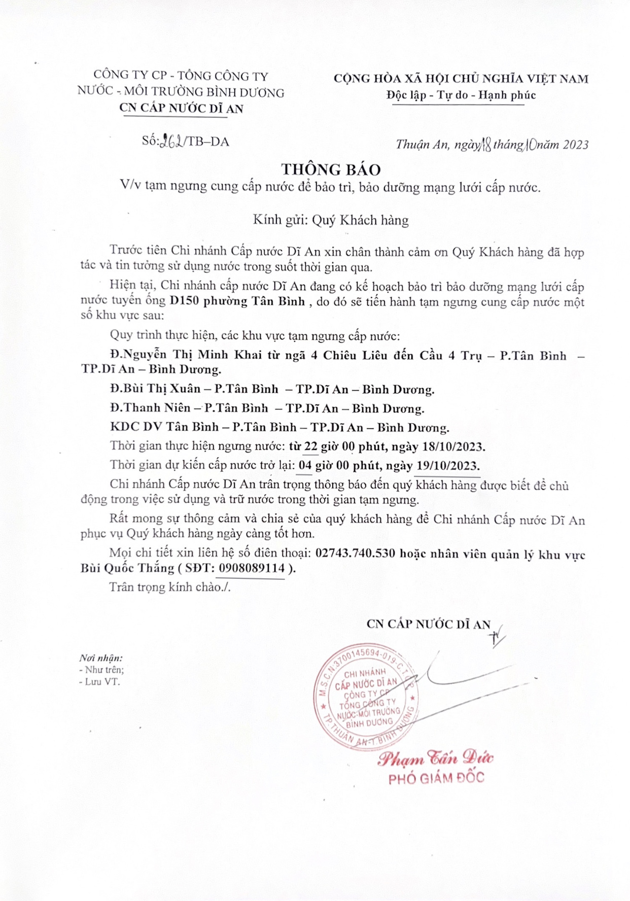 Tạm ngưng cung cấp nước khu vực Dĩ An : Đường Nguyễn Thị Minh Khai từ ngã 4 Chiêu Liêu đến Cầu 4 Trụ, P. Tân Bình, TP.Dĩ An-BD. Đường Bùi Thị Xuân - Đường Thanh Niên - KDC DV Tân Bình, P. Tân Bình, TP. Dĩ An, BD