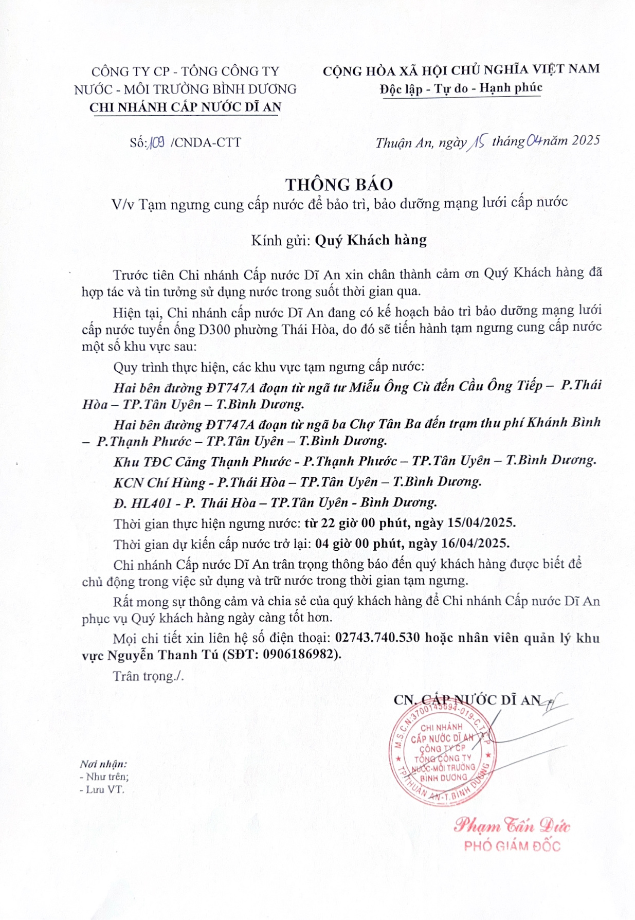 Tạm ngưng cung cấp nước khu vực Dĩ An : Hai bên đường ĐT747A đoạn từ ngã 4 Miễu Ông Cù đến cầu Ông Tiếp - KCN Chí Hùng - Đ.HL401, P. Thái Hòa. Hai bên Đ.ĐT747A đoạn từ ngã 3 Chợ Tân Ba đến trạm thu phí Khánh Bình - Khu TĐC Cảng Thạnh Phước, P. Thạnh Phước