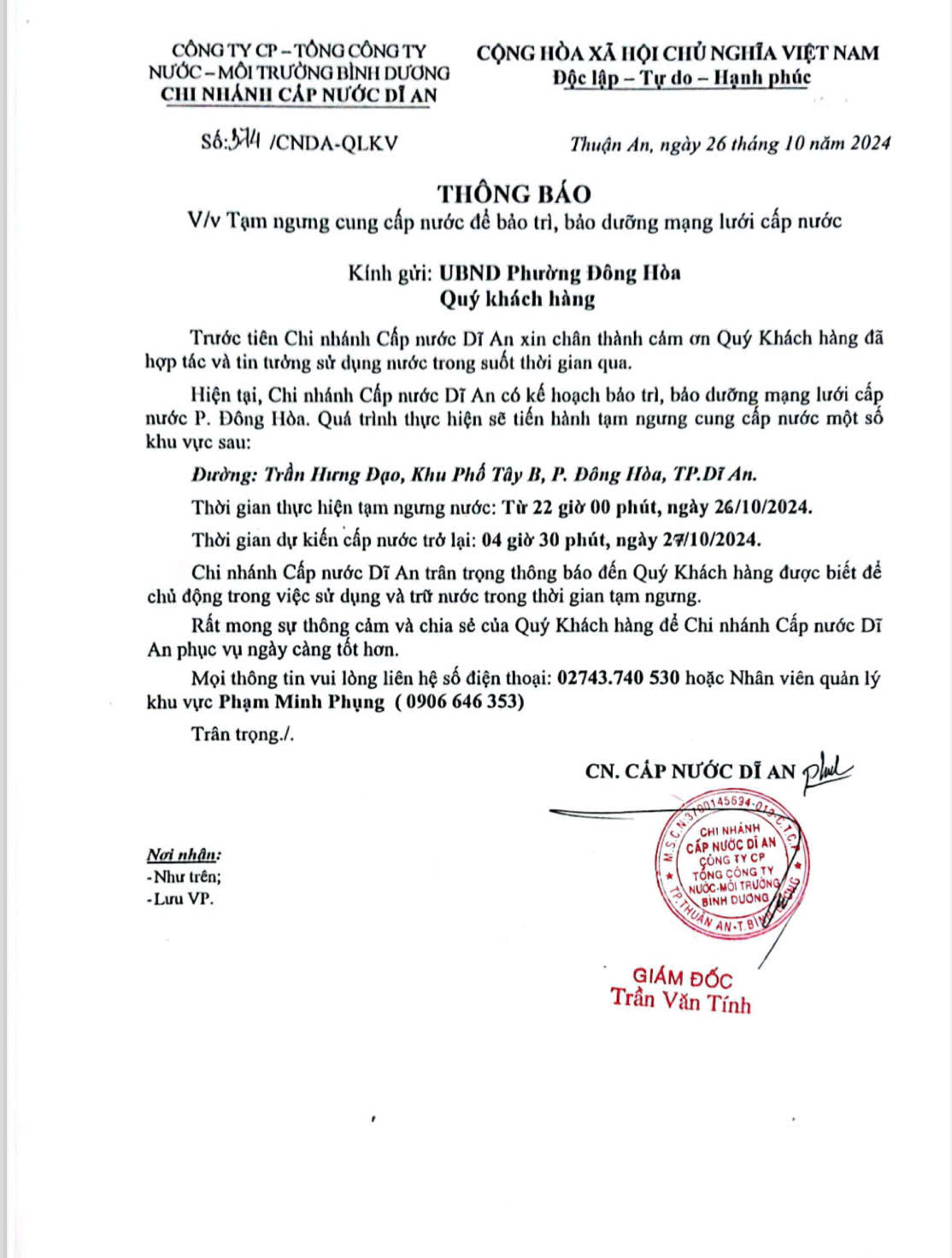 Tạm ngưng cung cấp nước khu vực Dĩ An : Đường Trần Hưng Đạo, Khu phố Tây B, Phường Đông Hòa, TP. Dĩ An