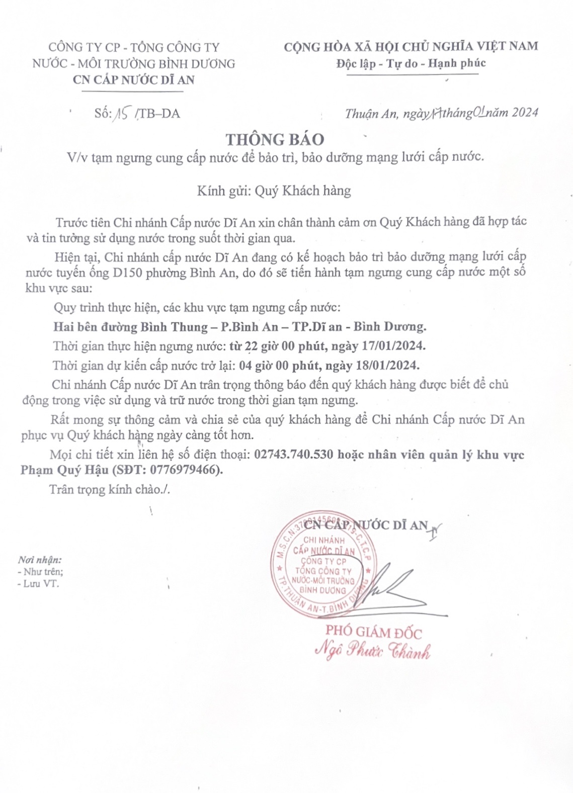 Tạm ngưng cung cấp nước khu vực Dĩ An : Hai bên đường Bình Thung, Phường Bình An, TP. Dĩ An, BD
