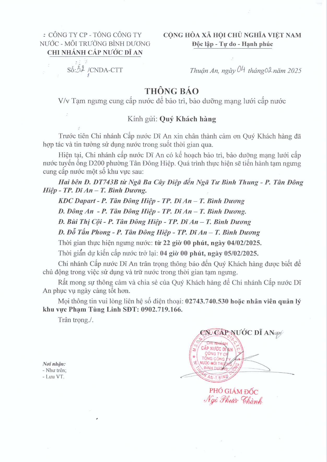 Tạm ngưng cung cấp nước khu vực Dĩ An : Hai bên đường ĐT743B từ Ngã Ba Cây Điệp đến Ngã Tư Bình Thung - KDC Dapart - Đ. Đông An - Đ. Bùi Thị Cội - Đ. Đỗ Tấn Phong, P. Tân Đông Hiệp, TP. Dĩ An, Tỉnh BD