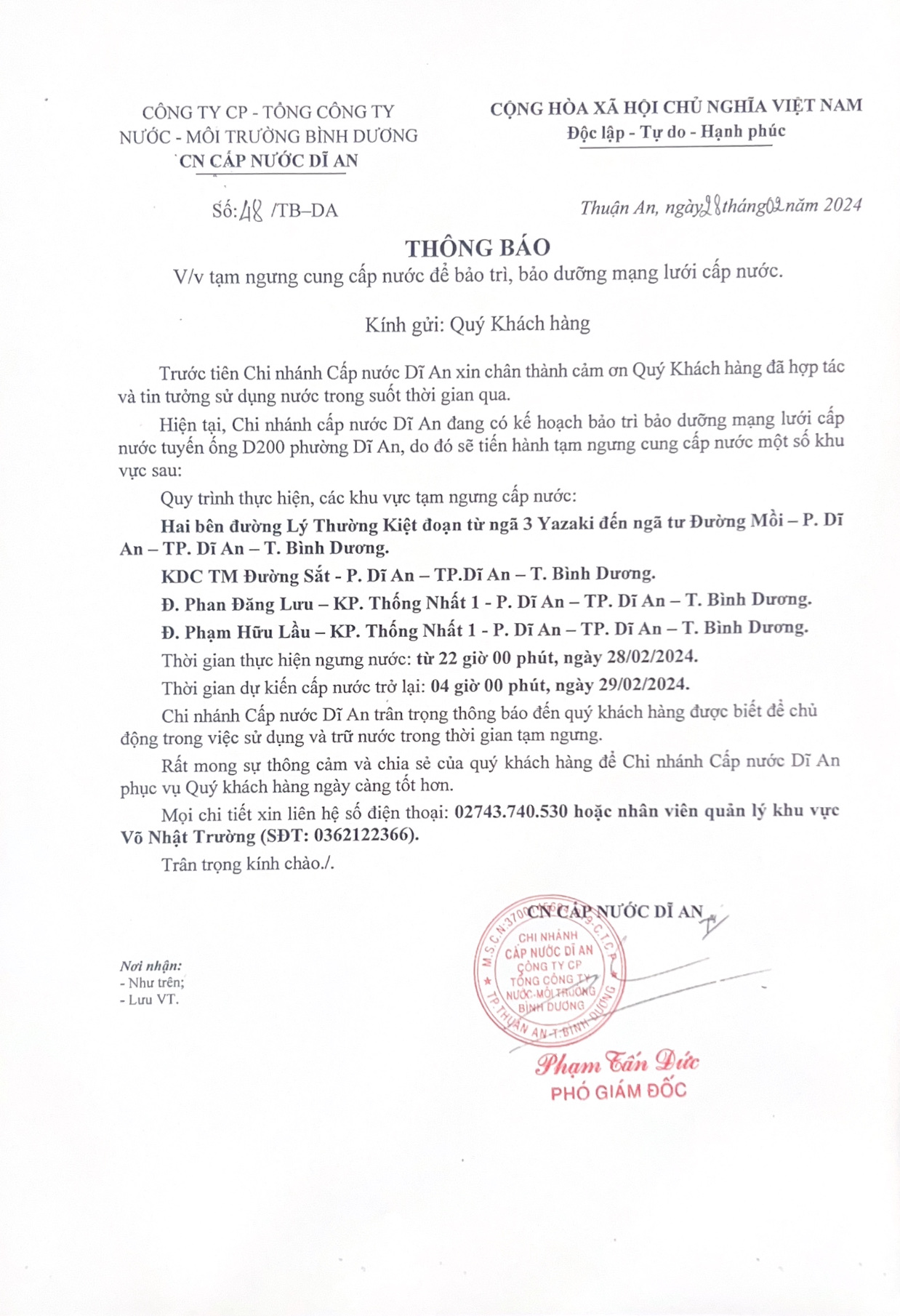 Tạm ngưng cung cấp nước khu vực Dĩ An : Hai bên đường Lý Thường Kiệt đoạn từ ngã 3 Yazaki đến ngã tư Đường Mồi - KDC TM Đường Sắt - Đường Phan Đăng Lưu - Đường Phạm Hữu Lầu, KP. Thống Nhất 1, P. Dĩ An, TP. Dĩ An, BD