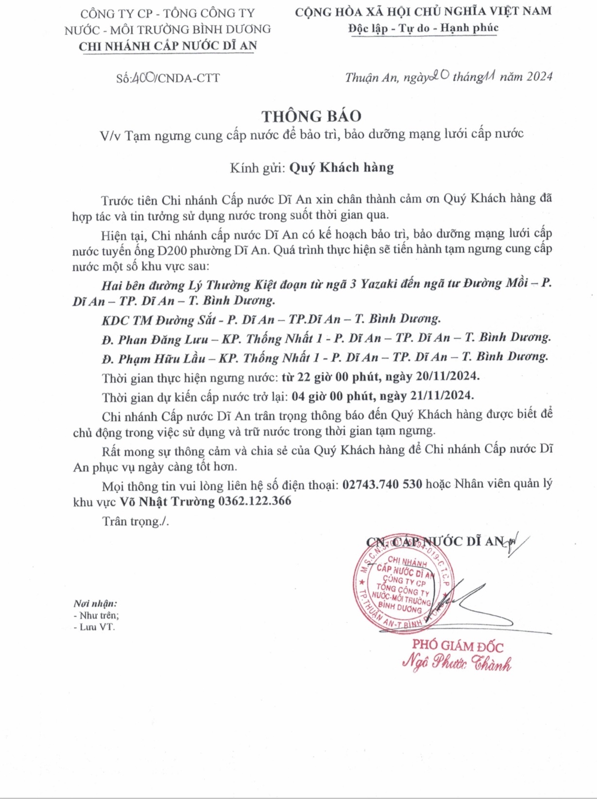 Tạm ngưng cung cấp nước khu vực Dĩ An : Hai bên đường Lý Thường Kiệt đoạn từ ngã 3 Yazaki đến ngã tư Đường Mồi - P.Dĩ An. KDC TM Đường Sắt, P. Dĩ An. Đường Phan Đăng Lưu - Đường Phạm Hữu Lầu, KP. Thống Nhất 1, P. Dĩ An, TP. Dĩ An, BD.