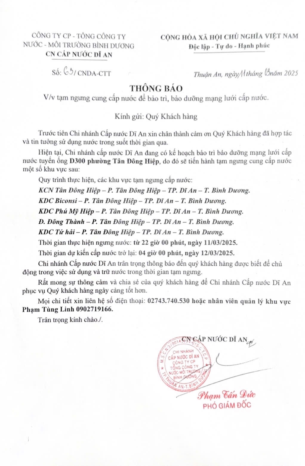 Tạm ngưng cung cấp nước khu vực Dĩ An : KCN Tân Đông Hiệp - KDC Biconsi - KDC Phú Mỹ Hiệp - Đ. Đông Thành - KDC Tứ Hải , P. Tân Đông Hiệp, TP. Dĩ An, Tỉnh Bình Dương