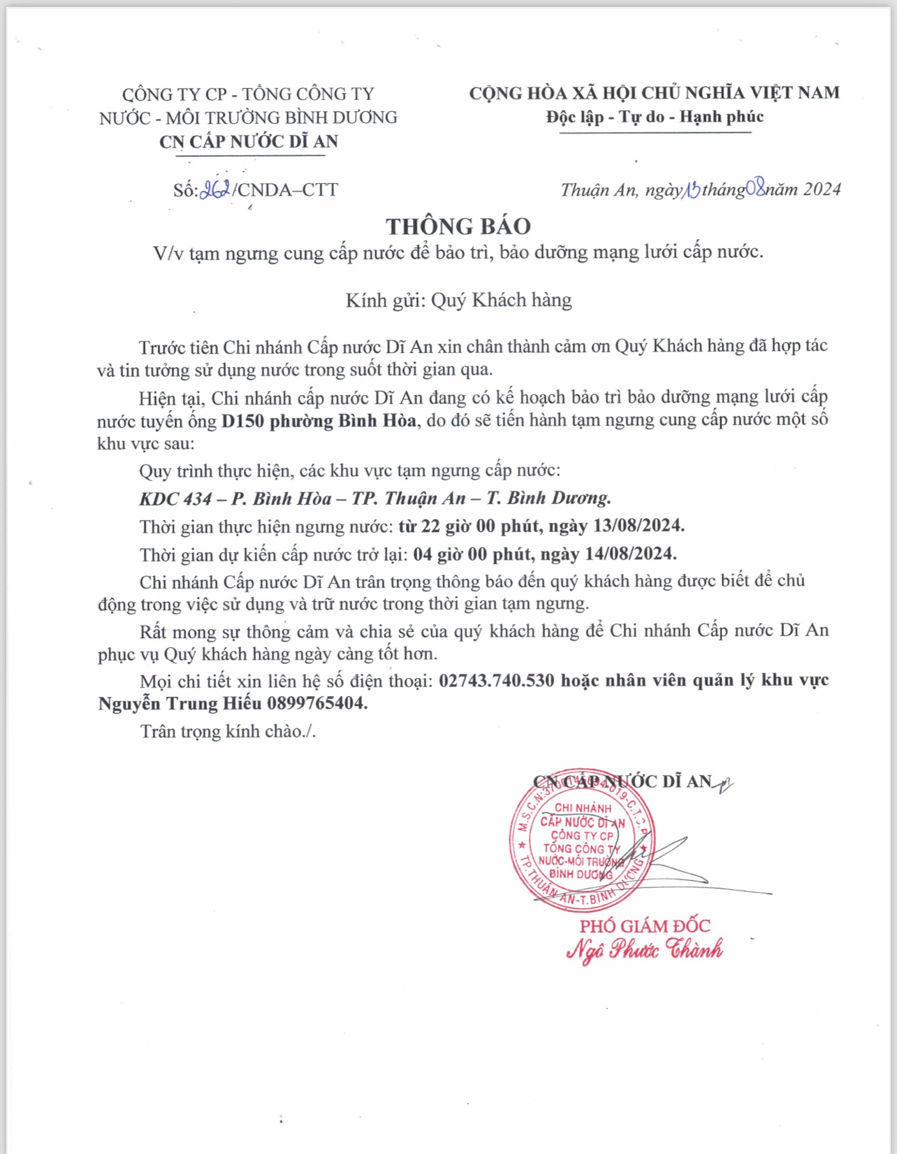 Tạm ngưng cung cấp nước khu vực Dĩ An : KDC 434, Phường Bình Hòa, Thành phố Thuận An, Tỉnh Bình Dương