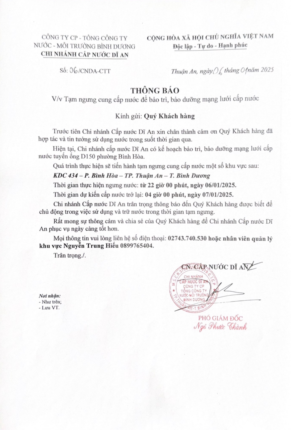 Tạm ngưng cung cấp nước khu vực Dĩ An : KDC 434, Phường Bình Hòa, Thành phố Thuận An, Tỉnh Bình Dương