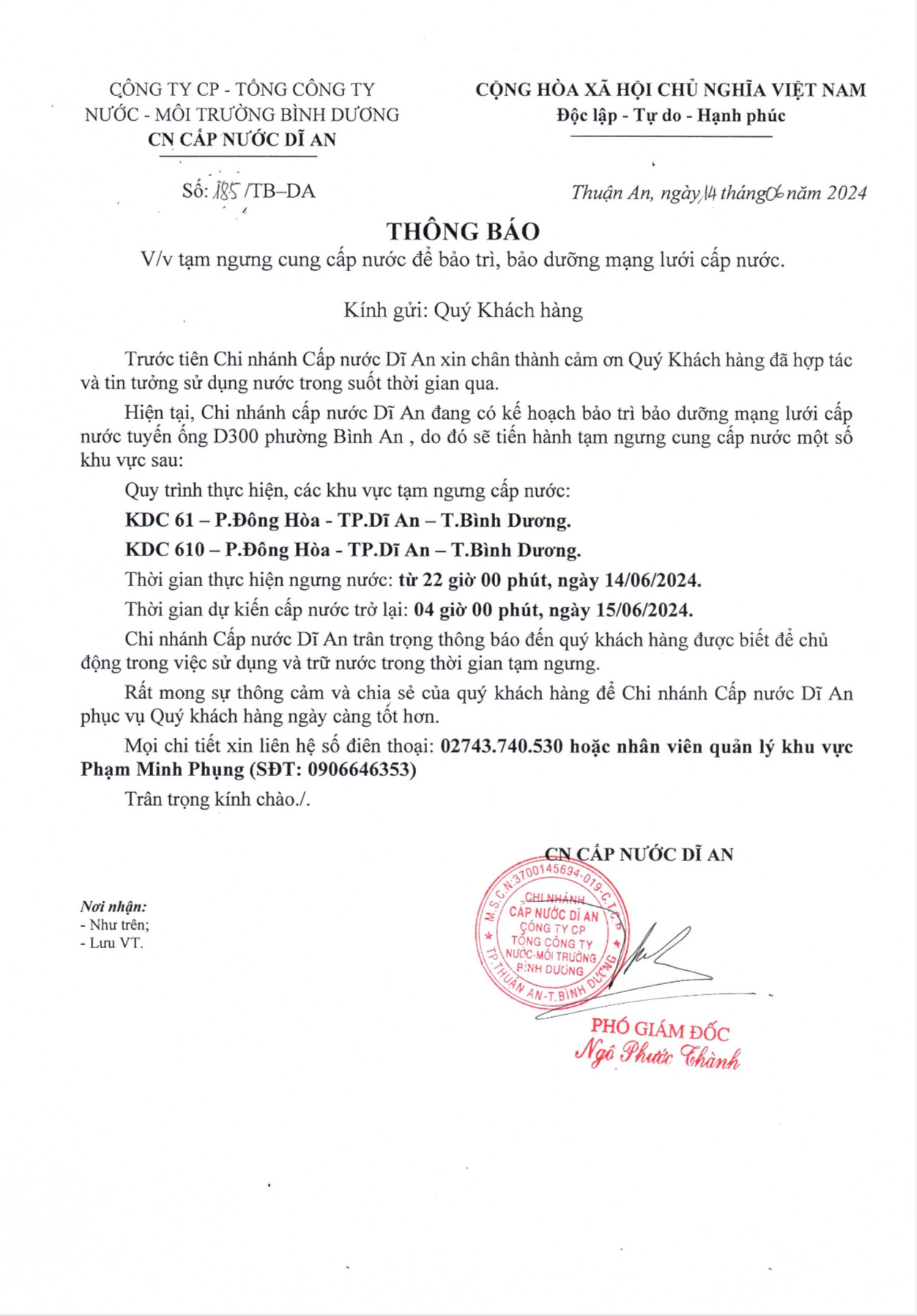 Tạm ngưng cung cấp nước khu vực Dĩ An : KDC 61 & KDC 610, Phường Đông Hòa, TP. Dĩ An, Tỉnh Bình Dương