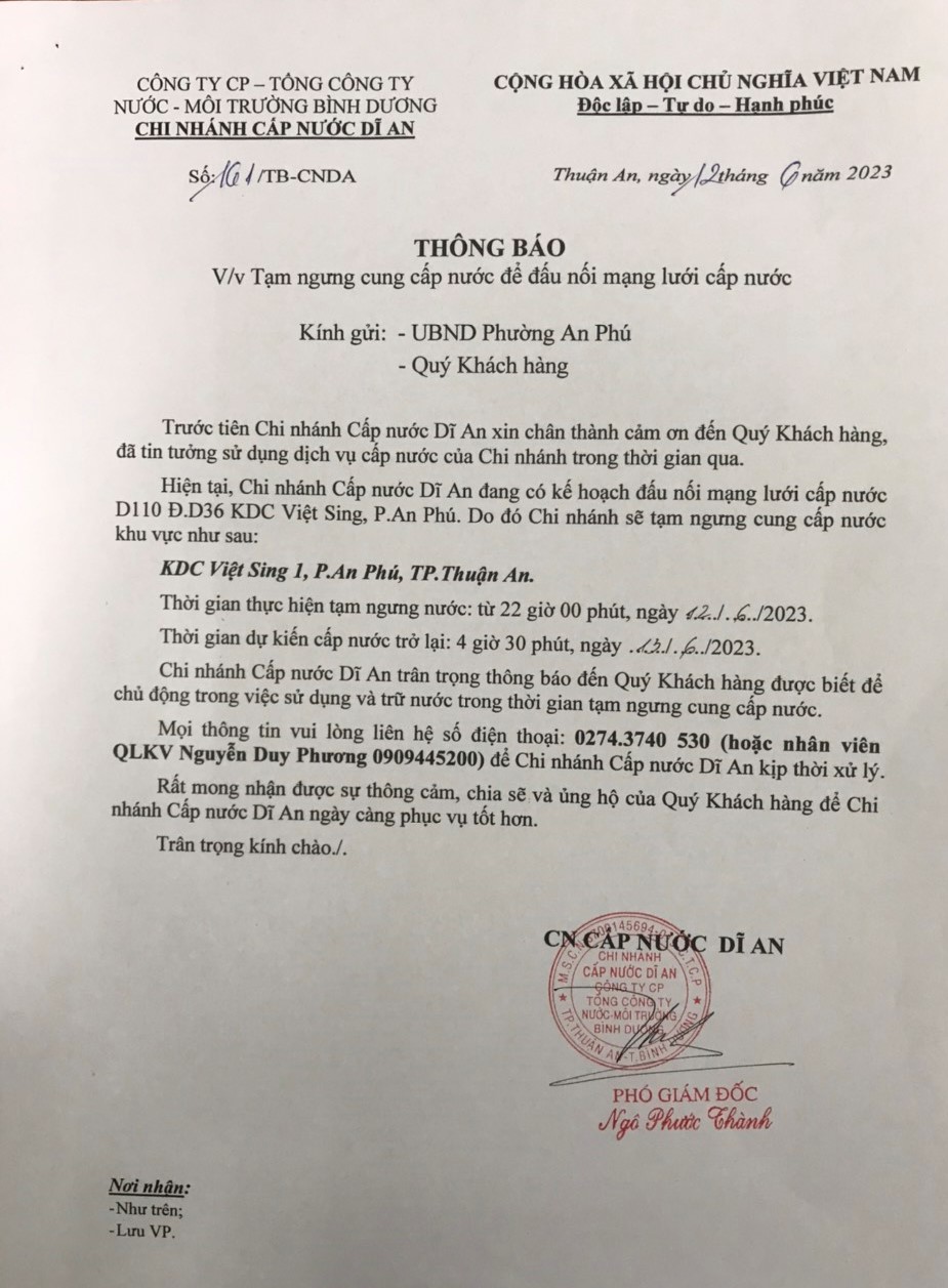 Tạm ngưng cung cấp nước khu vực Dĩ An: KDC Việt Sing