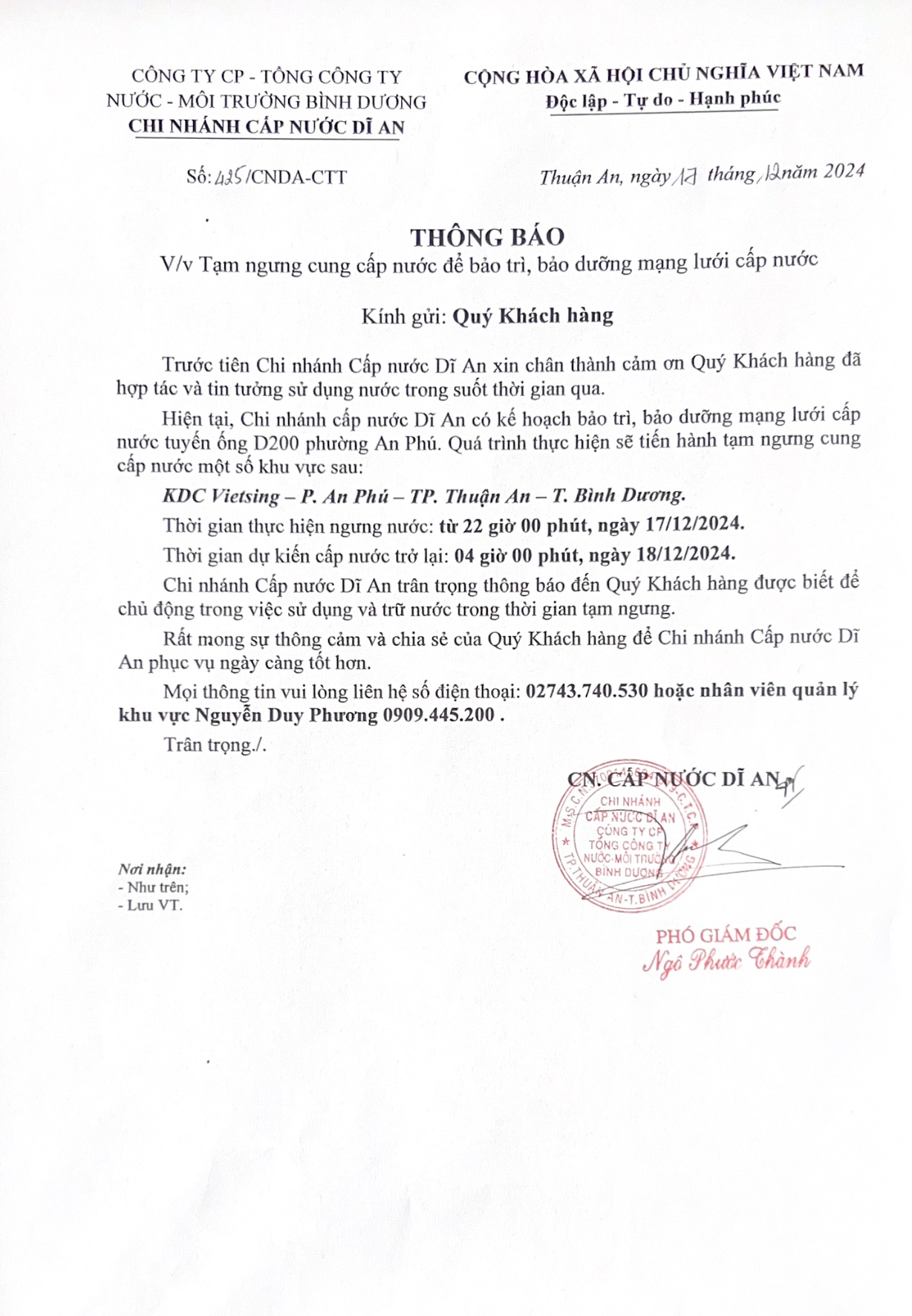 Tạm ngưng cung cấp nước khu vực Dĩ An : KDC Vietsing - P. An Phú - TP. Thuận An, Tỉnh Bình Dương