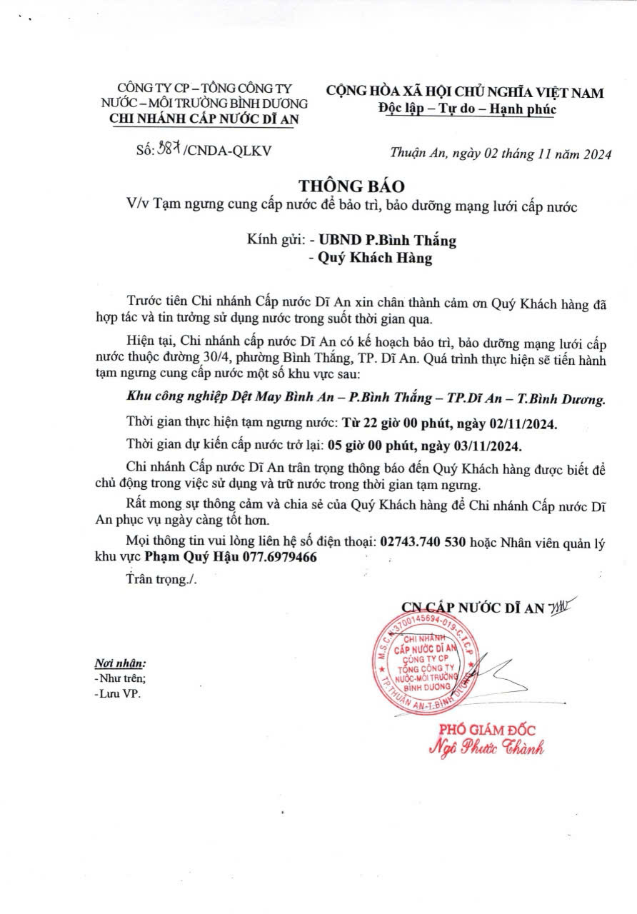 Tạm ngưng cung cấp nước khu vực Dĩ An : Khu Công Nghiệp Dệt May Bình An, P. Bình Thắng, TP. Dĩ An, Tỉnh BD