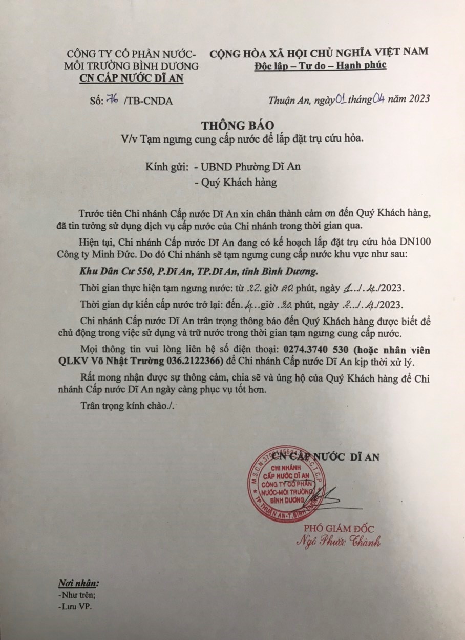 Tạm ngưng cung cấp nước khu vực Dĩ An - Khu Dân Cư 550