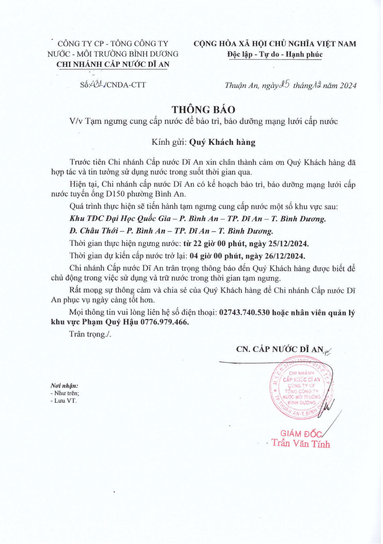 Tạm ngưng cung cấp nước khu vực Dĩ An : Khu TĐC Đại học Quốc Gia & Đường Châu Thới, Phường Bình An, TP. Dĩ An, Tỉnh Bình Dương