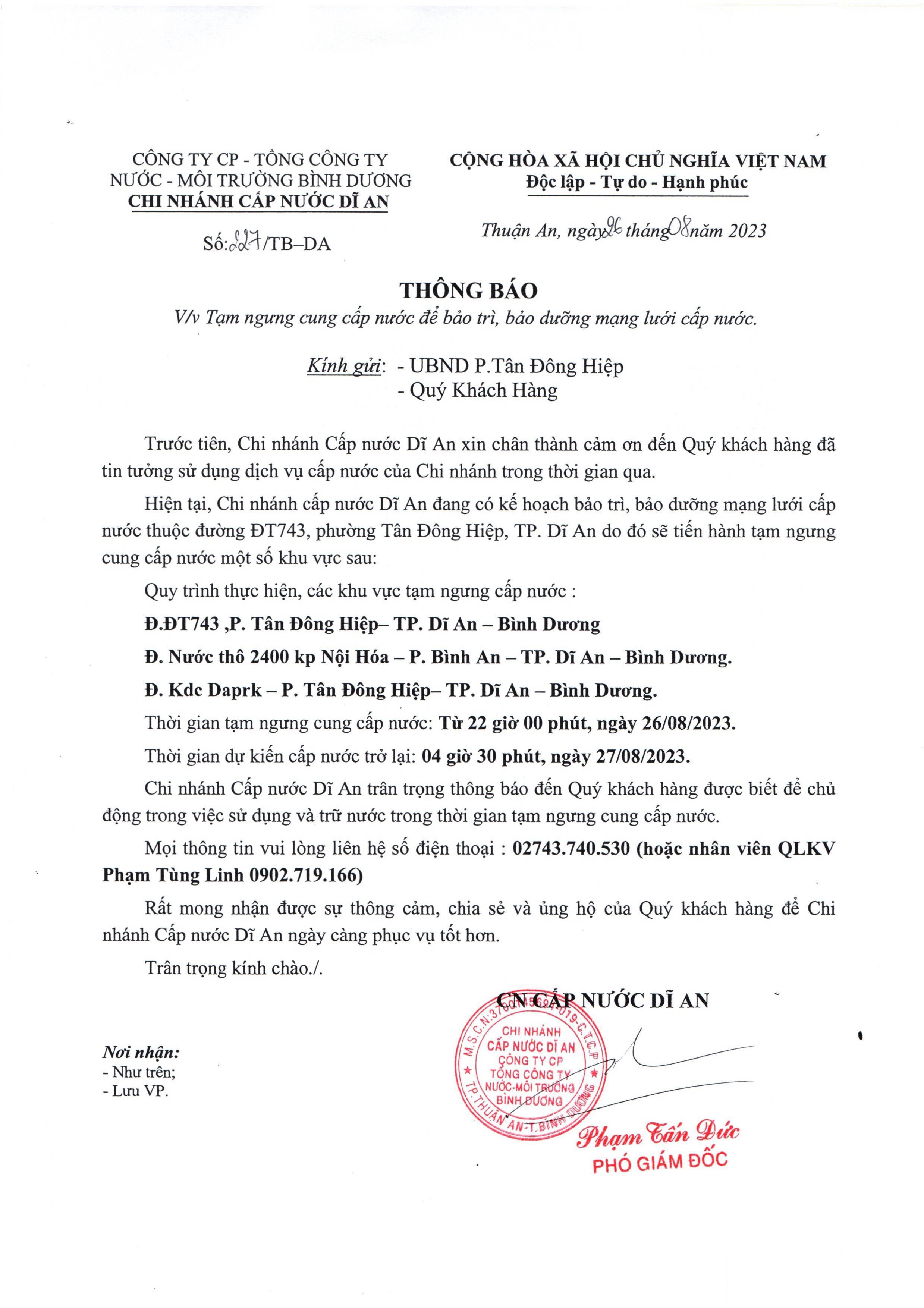 Tạm ngưng cung cấp nước khu vực Dĩ An : P. Tân Đông Hiệp, P. Bình An, TP. Dĩ An, Tỉnh BD