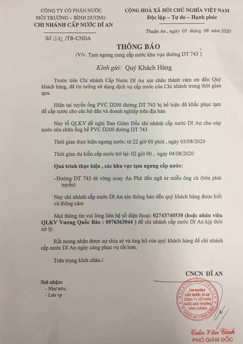 Tạm ngưng cung cấp nước khu vực đường ĐT 743 Dĩ An