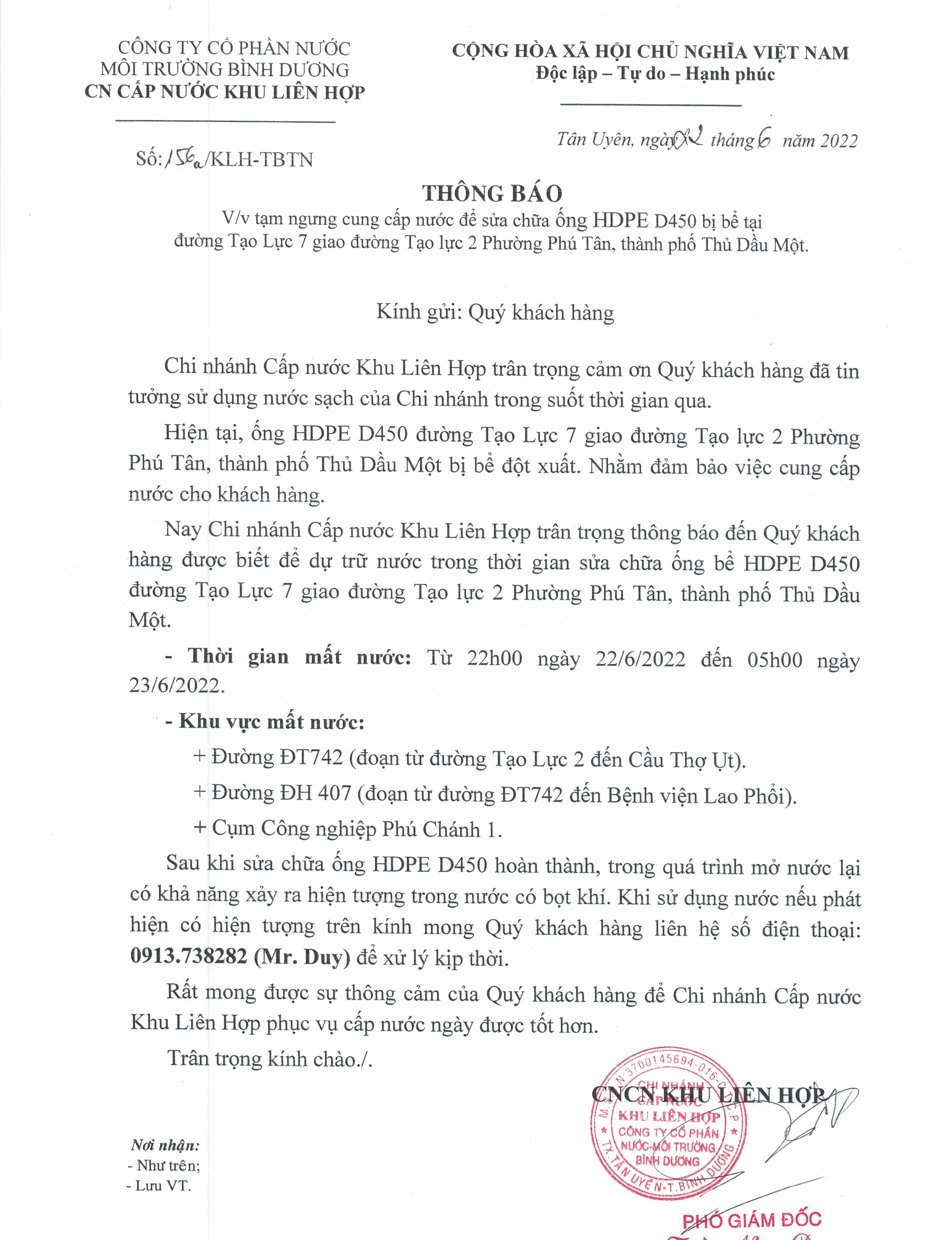 Tạm ngưng cấp nước khu vực Khu Liên Hợp: tuyến ống cấp nước D200 bên trái đường Đại lộ Bình Dương...