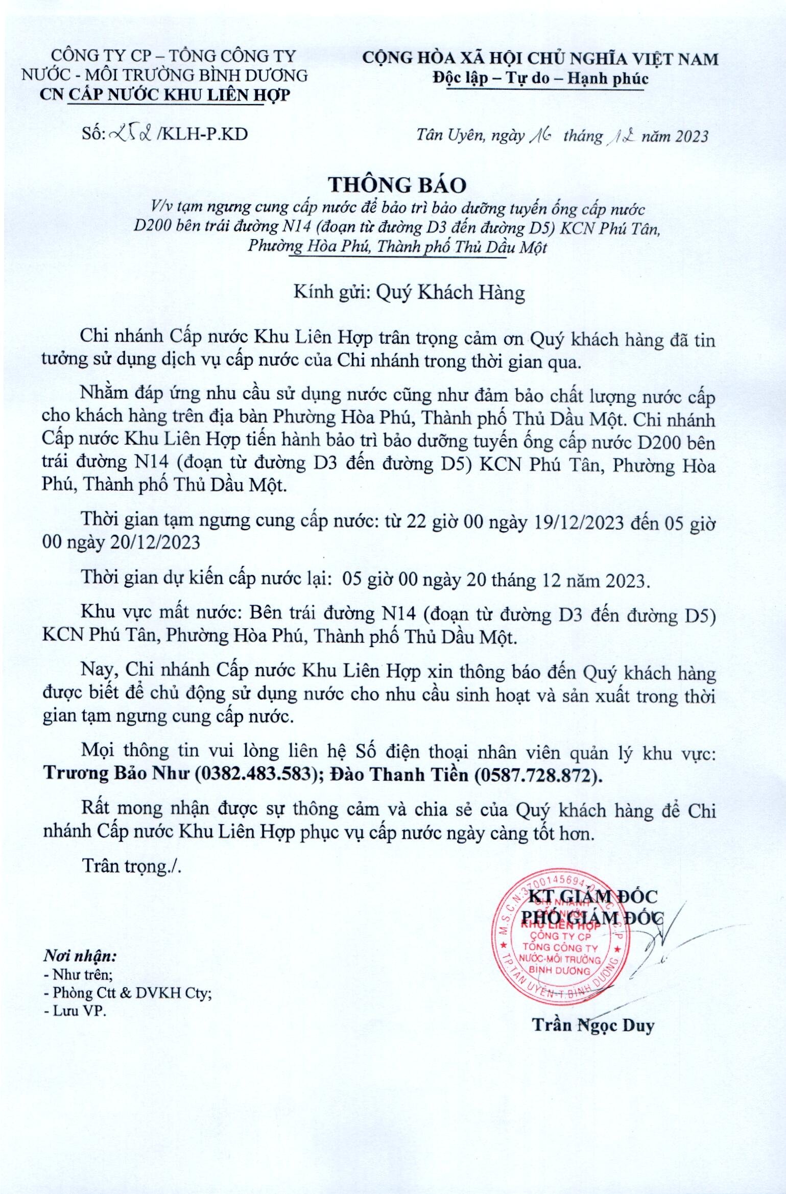 Tạm ngưng cung cấp nước khu vực Khu Liên Hợp: Bên trái đường N14 (Đoạn từ đường D3 đến đường D5)