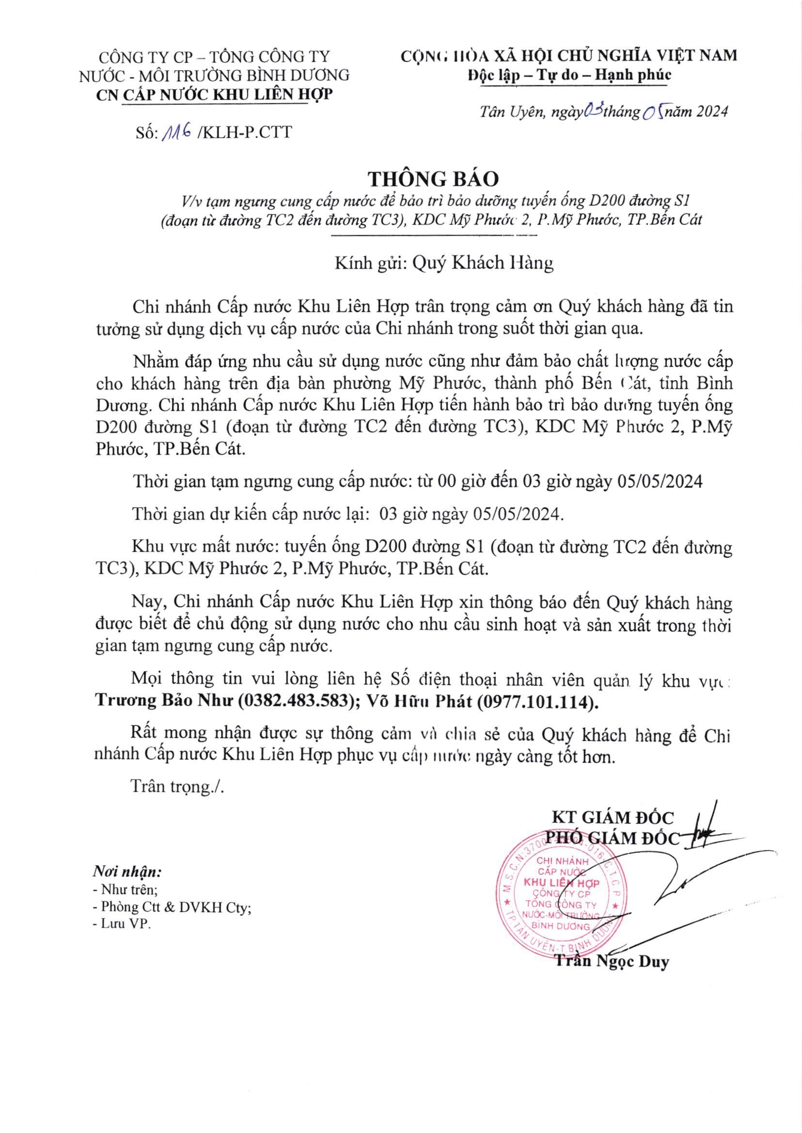 Tạm ngưng cung cấp nước khu vực Khu Liên Hợp: Đường S1 (Đoạn từ đường TC2 đến TC3), KDC Mỹ Phước 2, P.Mỹ Phước, TP Bến các