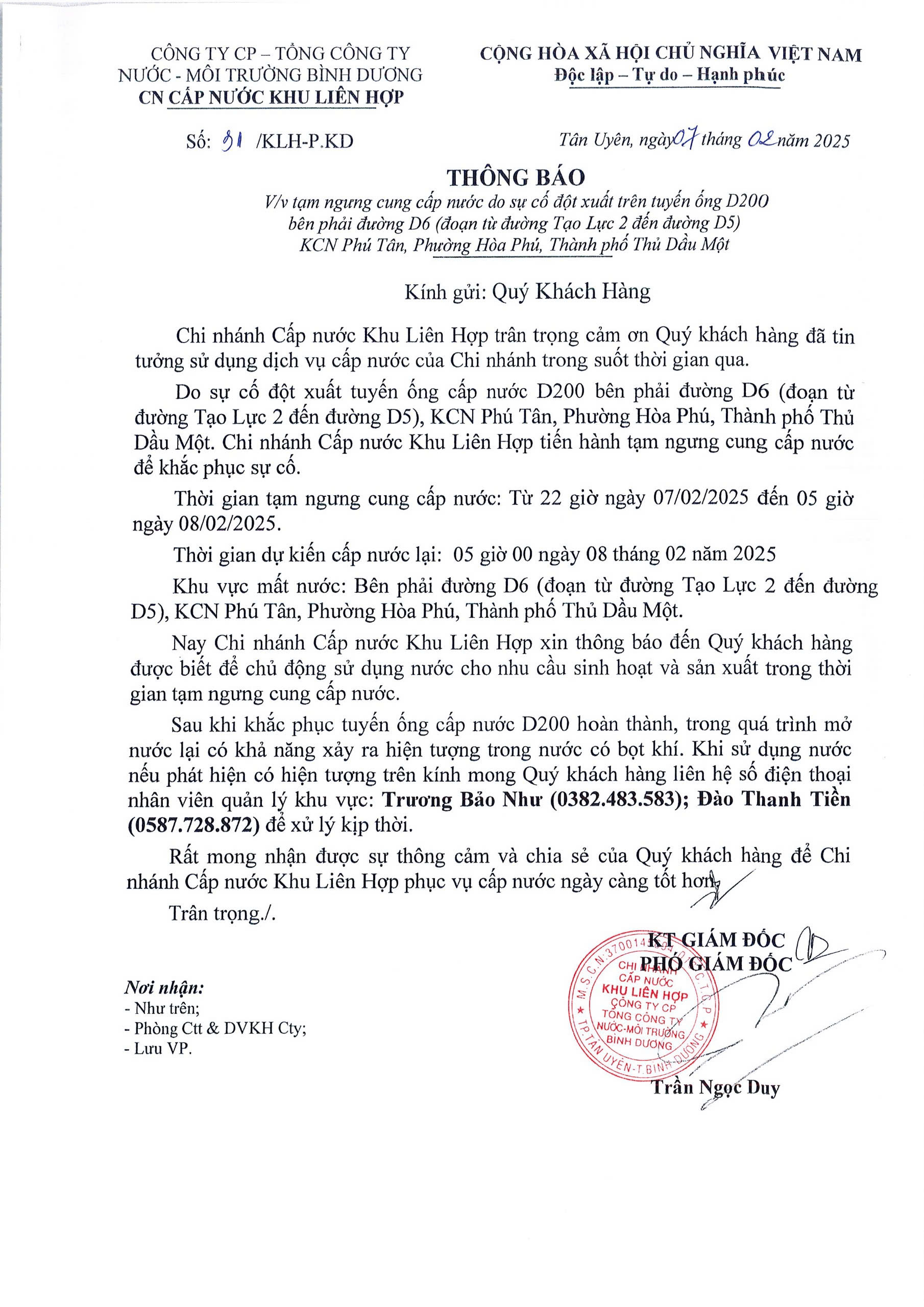 Tạm ngưng cung cấp nước khu vực KLH : Bên phải đường D6 (đoạn từ đường Tạo Lực 2 đến đường D5), KCN Phú Tân, Phường Hòa Phú, TP.TDM