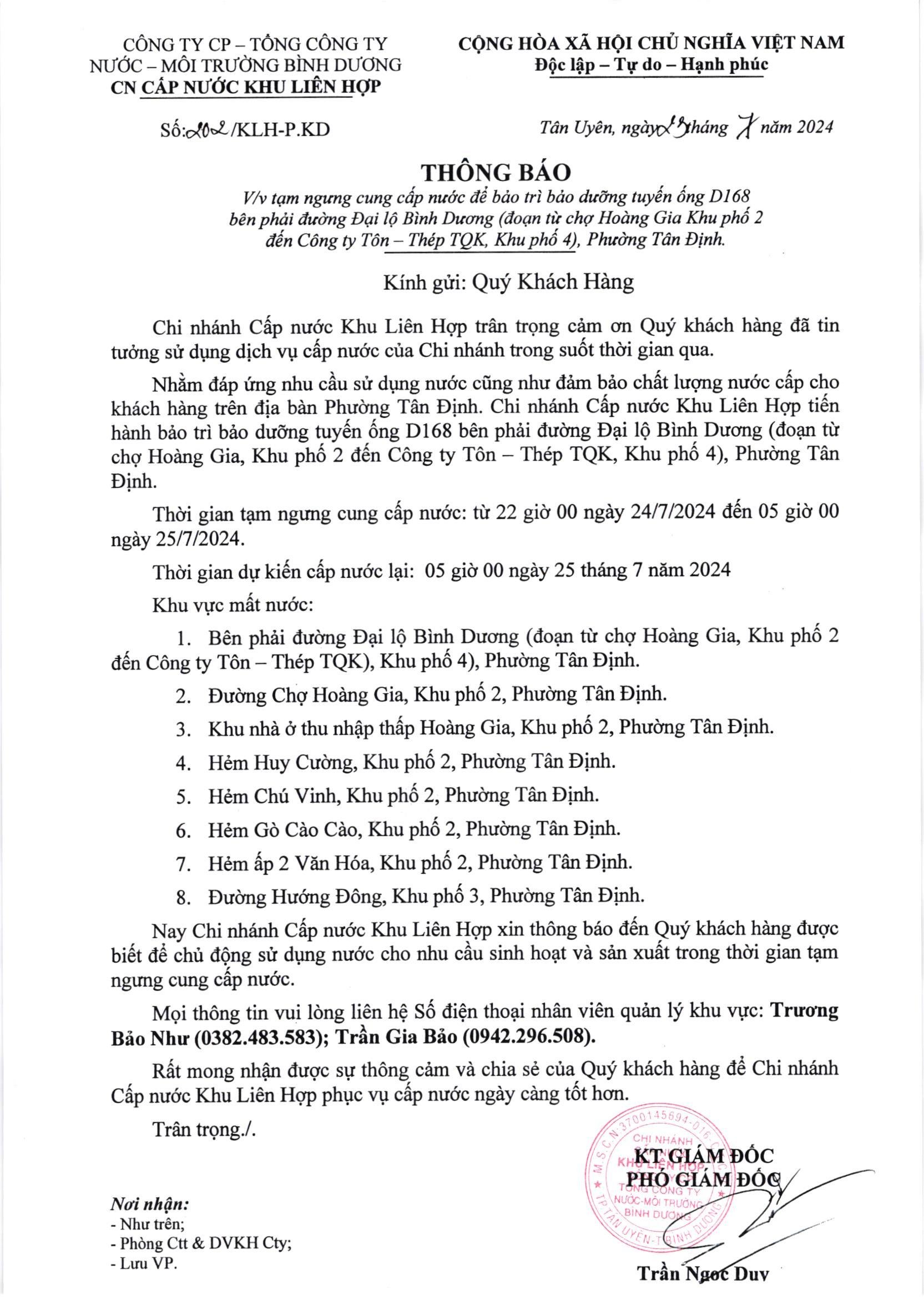 Tạm ngưng cung cấp nước khu vực KLH : Bên phải đường Đại lộ Bình Dương (đoạn từ Chợ Hoàng Gia khu phố 2 đến Công ty Tôn - Thép TQK, khu phố 4 ), Phường Tân Định