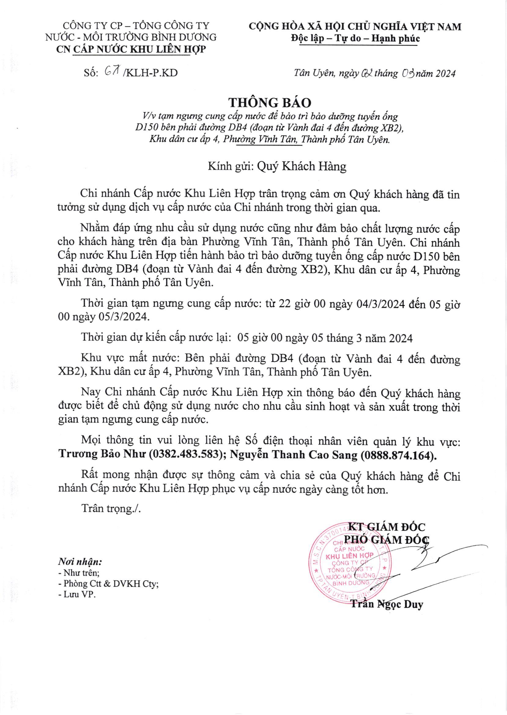 Tạm ngưng cung cấp nước khu vực KLH : Bên phải đường DB4 ( đoạn từ Vành đai 4 đến đường XB2), Khu dân cư ấp 4, Phường Vĩnh Tân, Thành phố Tân Uyên
