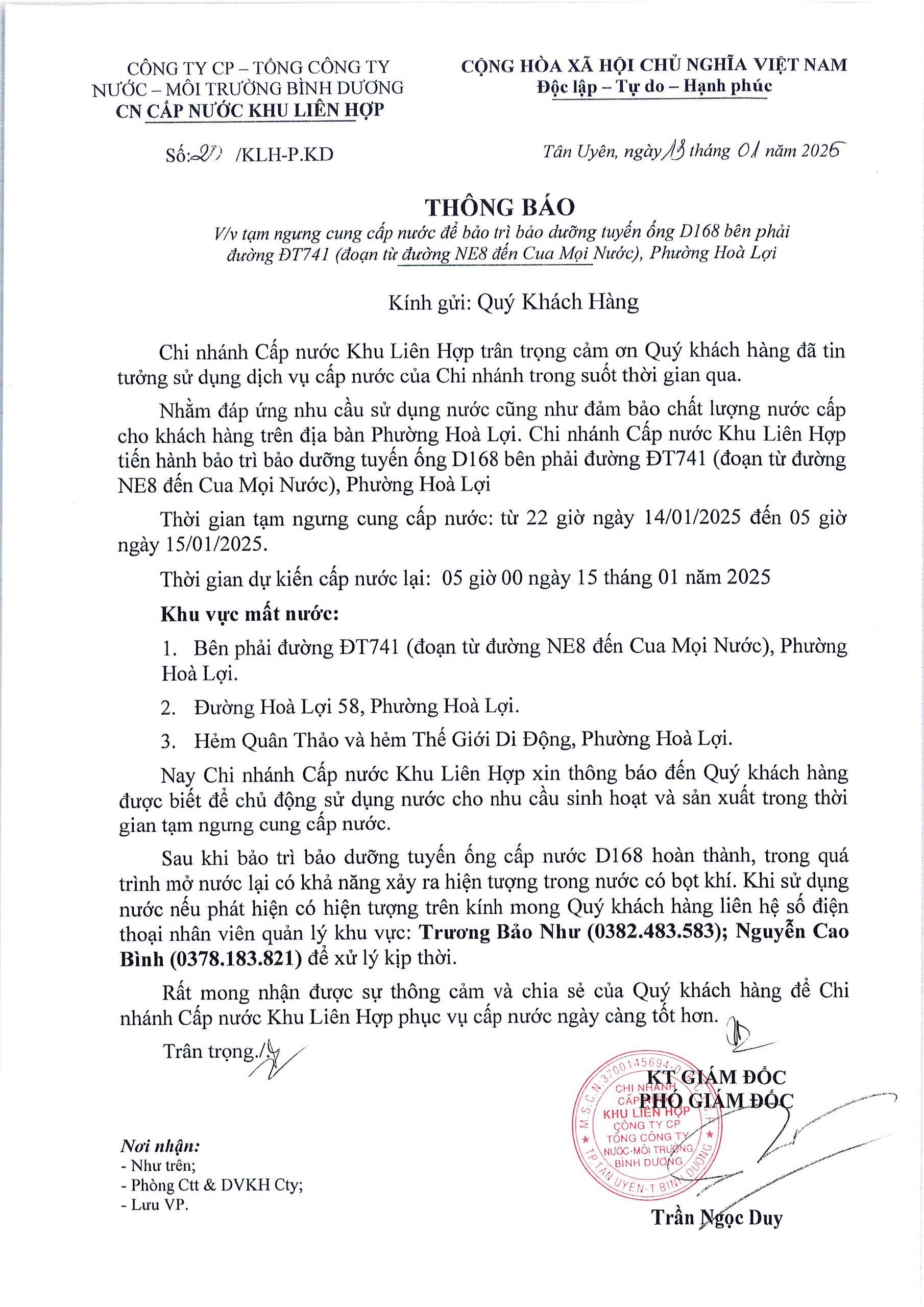 Tạm ngưng cung cấp nước khu vực KLH : Bên phải đường ĐT741 (đoạn từ đường NE8 đến Cua Mọi Nước), Phường Hòa Lợi, Thị xã Bến Cát