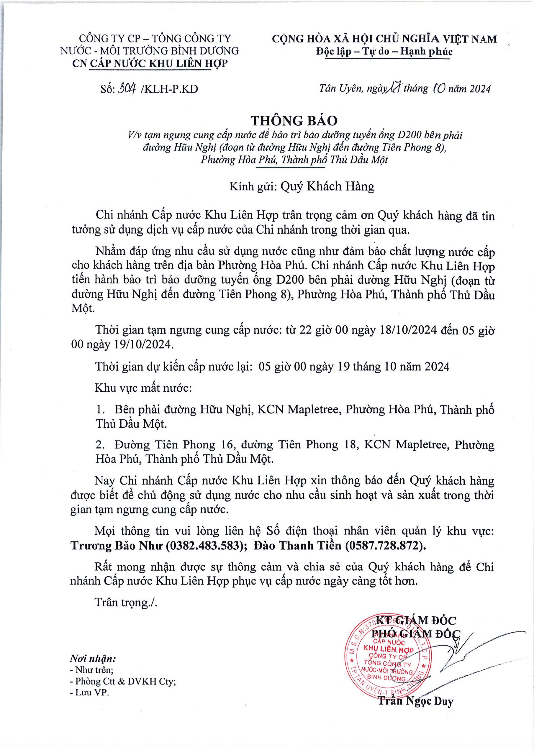Tạm ngưng cung cấp nước khu vực KLH : Bên phải đường Hữu Nghị (đoạn từ đường Hữu Nghị đến đường Tiên Phong 8), Phường Hòa Phú, TP.TDM
