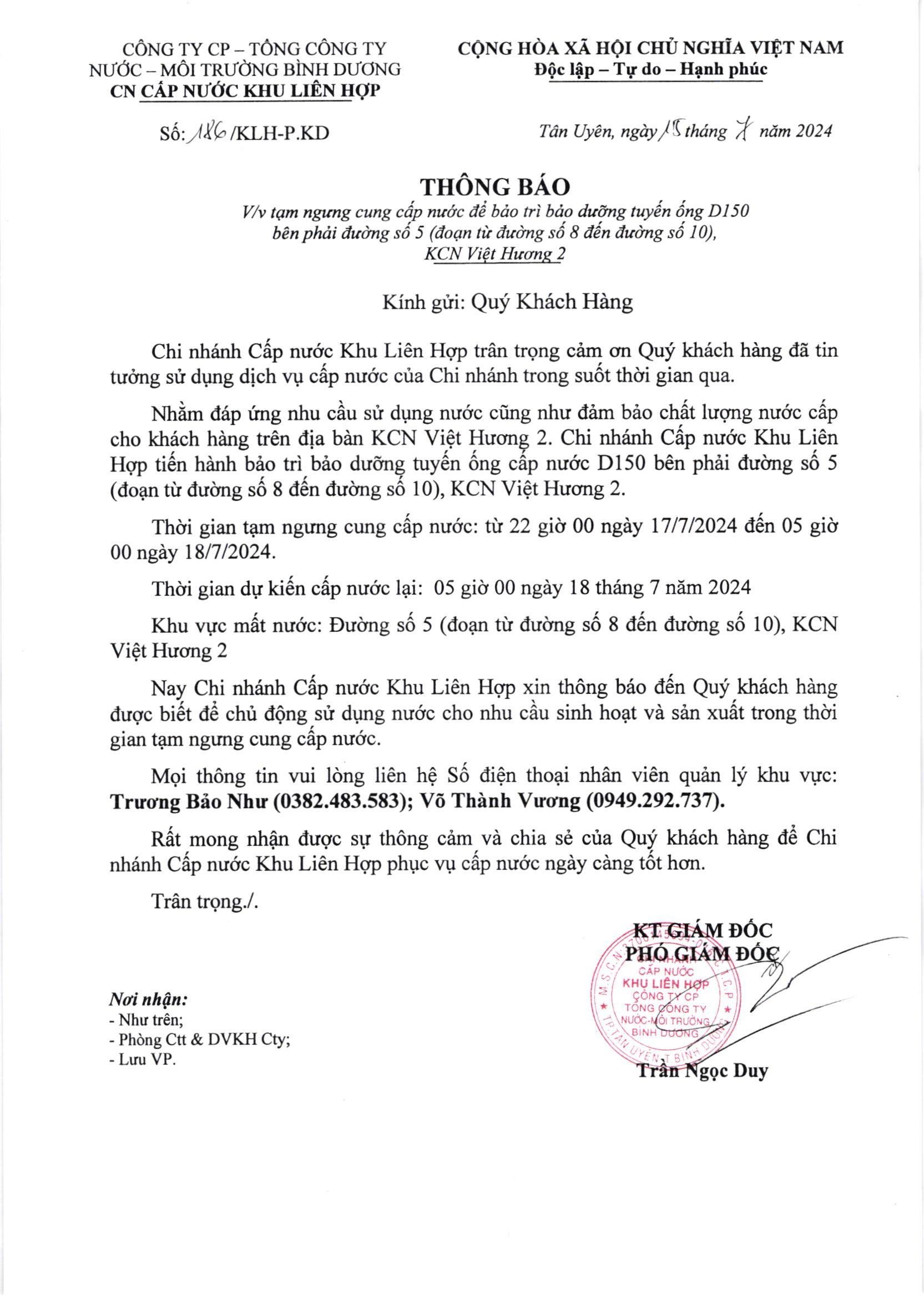Tạm ngưng cung cấp nước khu vực KLH : Bên phải đường số 5 ( đoạn từ đường số 8 đến đường số 10), KCN Việt Hương 2
