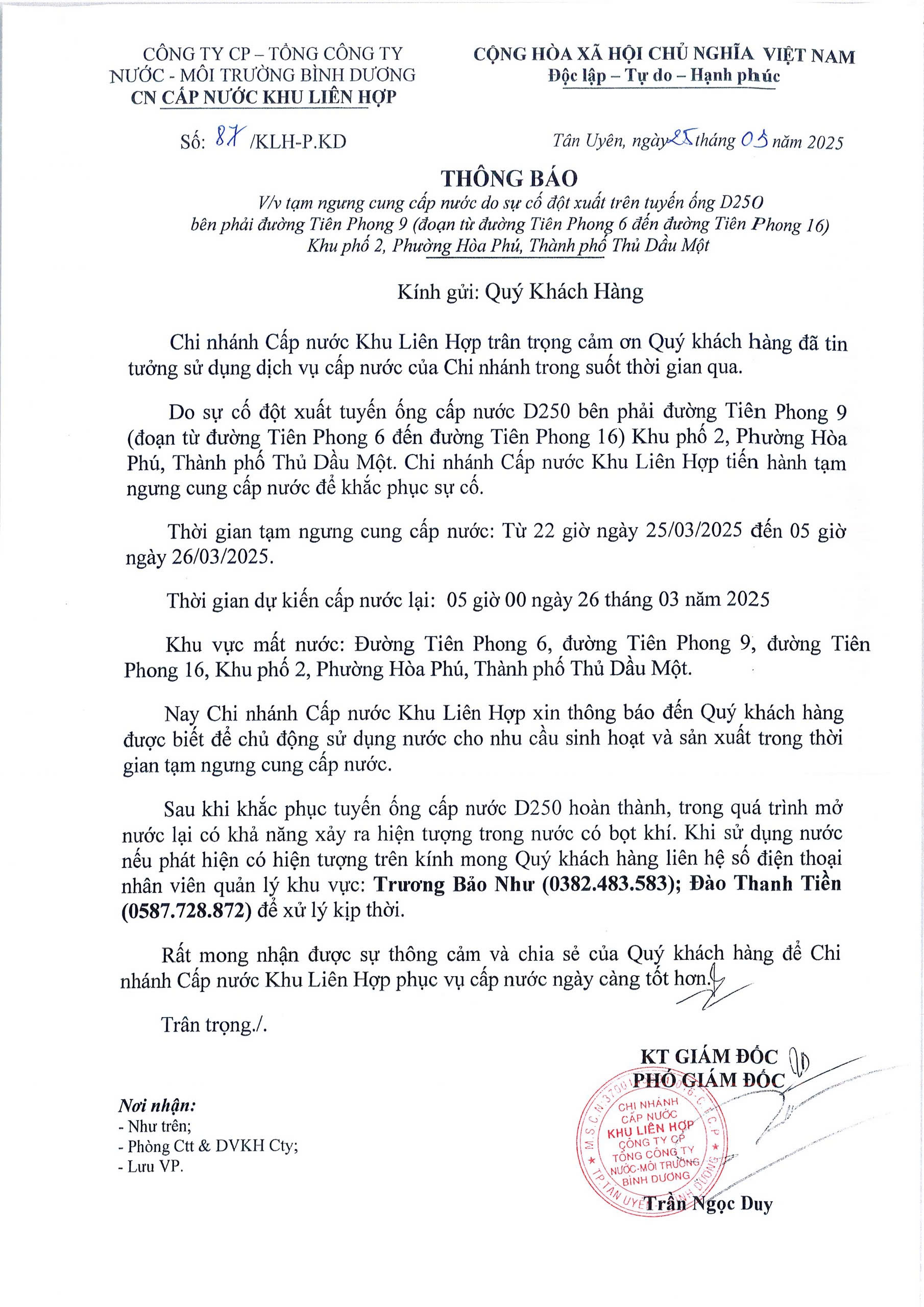 Tạm ngưng cung cấp nước khu vực KLH : Bên phải đường Tiên Phong 9 (đoạn từ đường Tiên Phong 6 đến đường Tiên Phong 16), khu phố 2, Phường Hòa Phú, TP.TDM
