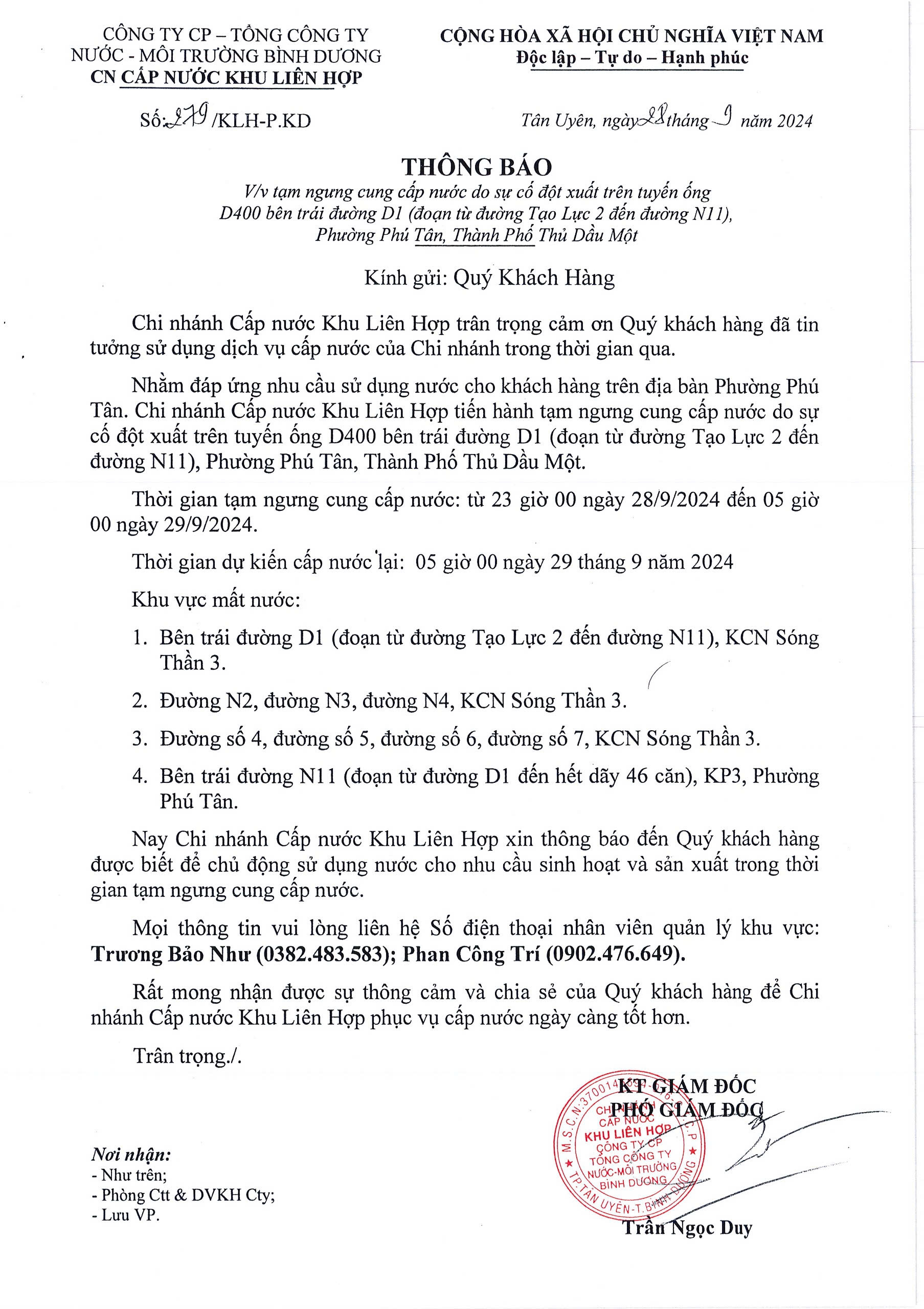 Tạm ngưng cung cấp nước khu vực KLH : Bên trái đường D1 (đoạn từ đường Tạo Lực 2 đến đường N11), P. Phú Tân, TP.TDM