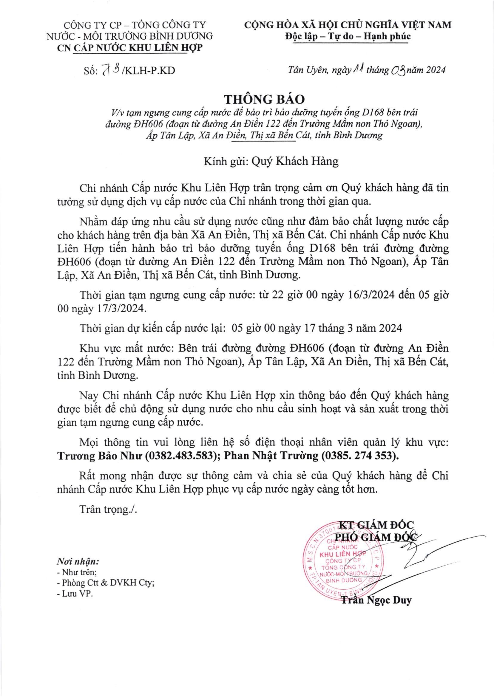 Tạm ngưng cung cấp nước khu vực KLH : Bên trái đường ĐH606 (đoạn từ đường An Điền 122 đến Trường Mầm Non Thỏ Ngoan), Ấp Tân Lập, Xã An Điền, Thị xã Bến Cát, Tỉnh Bình Dương