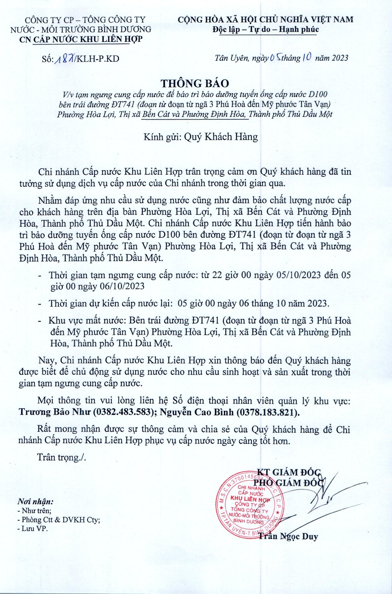 Tạm ngưng cung cấp nước khu vực KLH : Bên trái đường ĐT741 (đoạn từ ngã 3 Phú Hoà đến Mỹ Phước Tân Vạn), Phường Hoà Lợi, Tx. Bến Cát và P. Định Hoà, TP.TDM