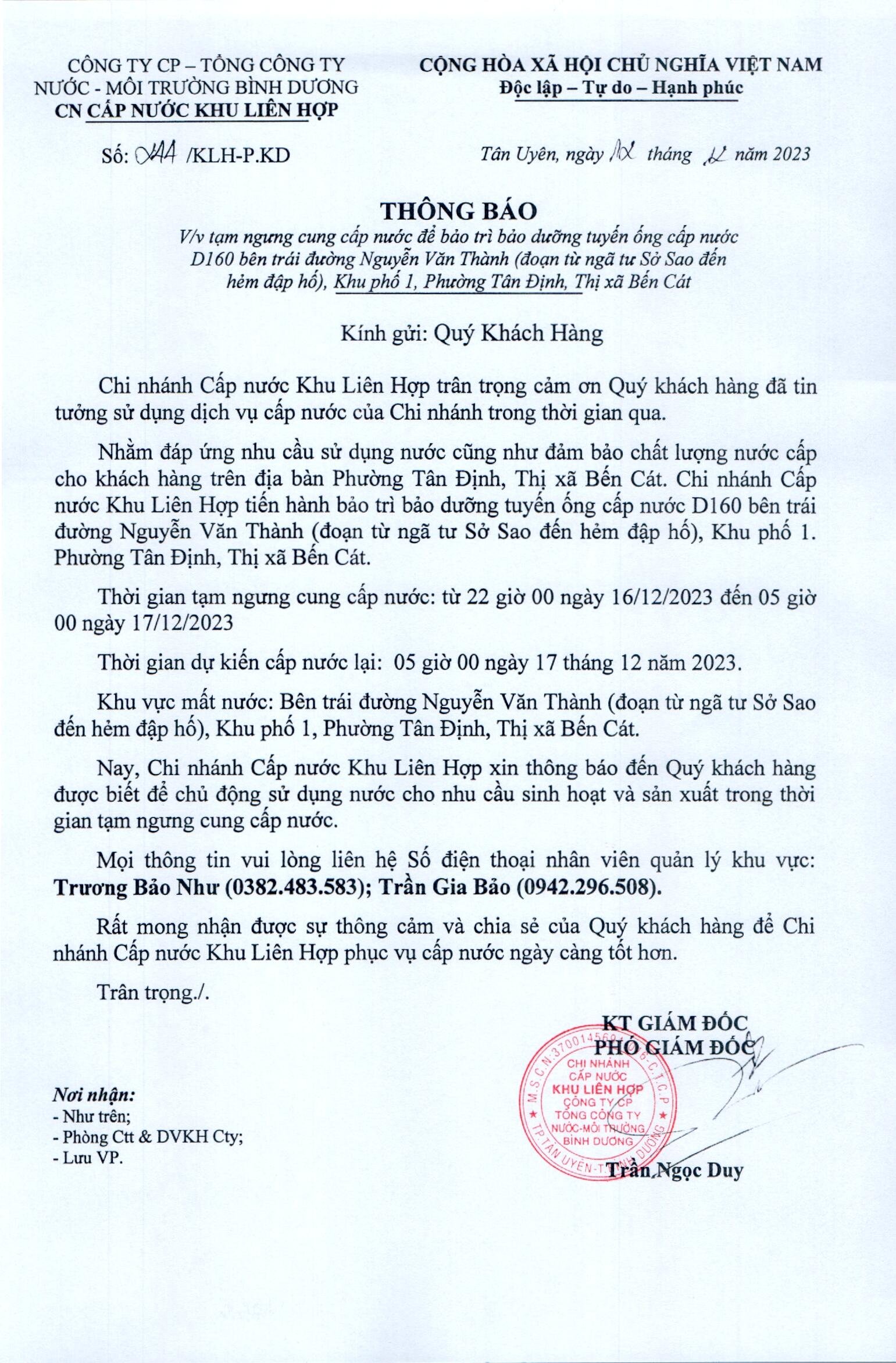 Tạm ngưng cung cấp nước khu vực KLH : Bên trái đường Nguyễn Văn Thành (đoạn từ ngã tư Sở Sao đến hẻm đập hố), Khu phố 1, Phường Tân Định, Thị xã Bến Cát