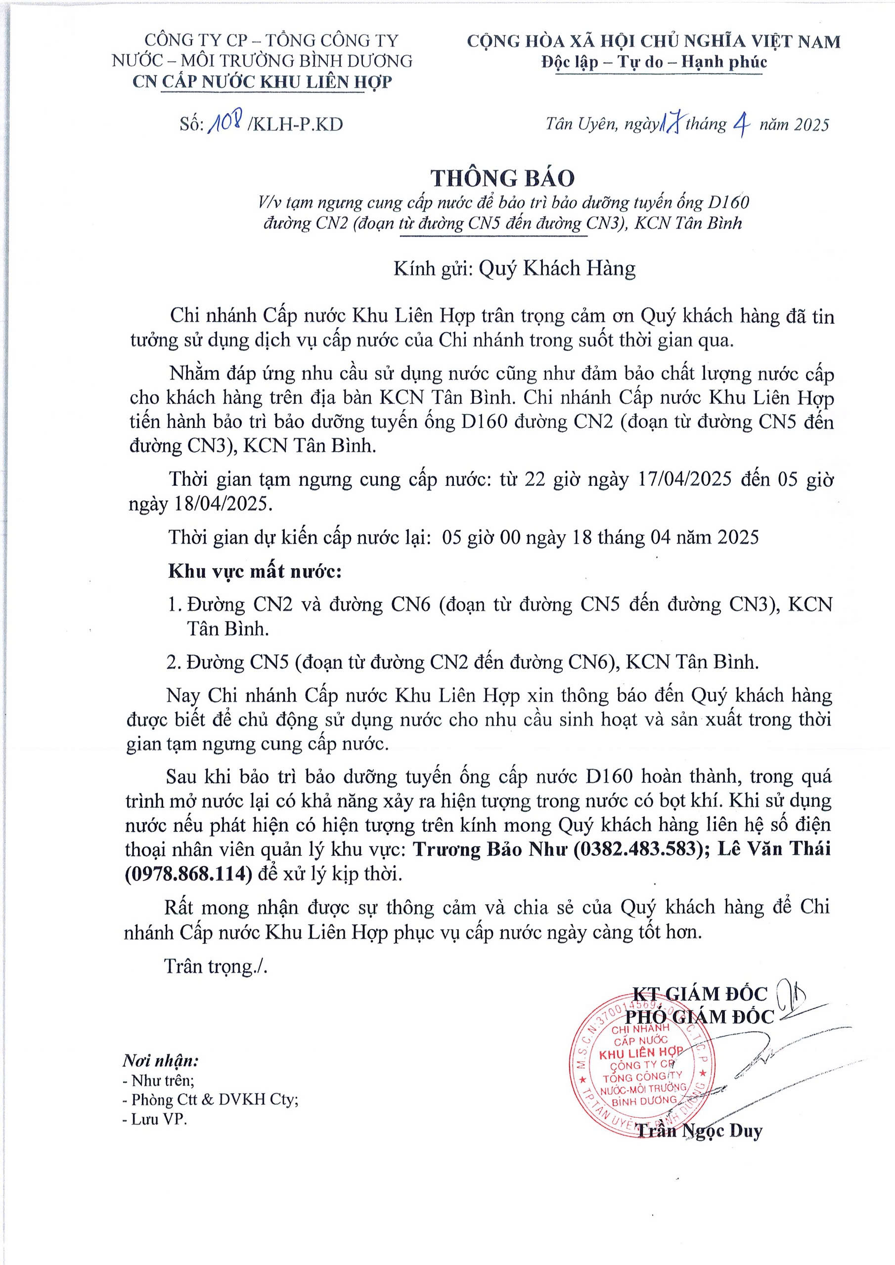 Tạm ngưng cung cấp nước khu vực KLH : Đường CN2 (đoạn từ đường CN5 đến đường CN3), KCN Tân Bình