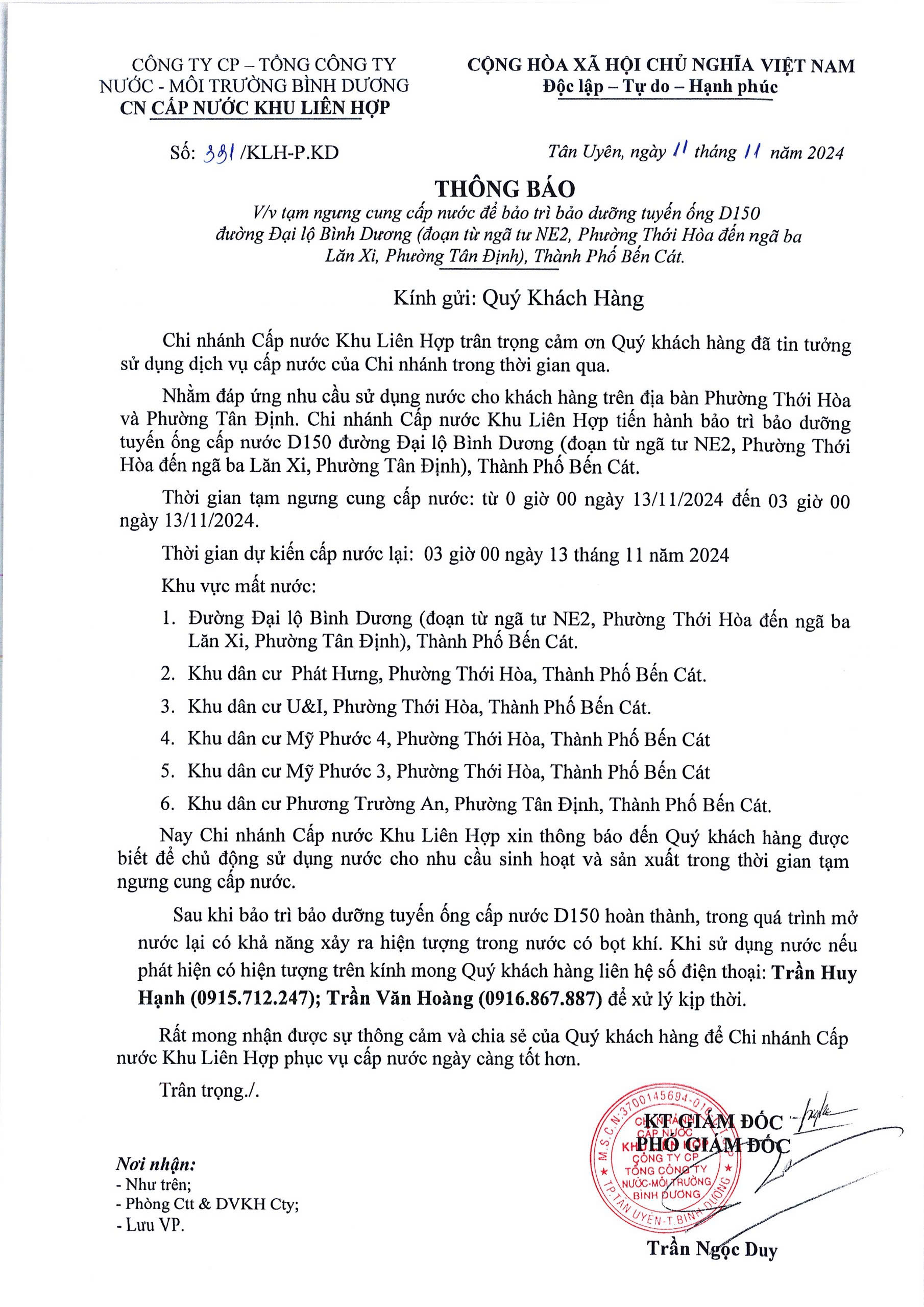 Tạm ngưng cung cấp nước khu vực KLH : Đường Đại lộ Bình Dương ( đoạn từ ngã tư NE2, Phường Thới Hòa đến ngã ba Lăn Xi, Phường Tân Định), TP. Bến Cát