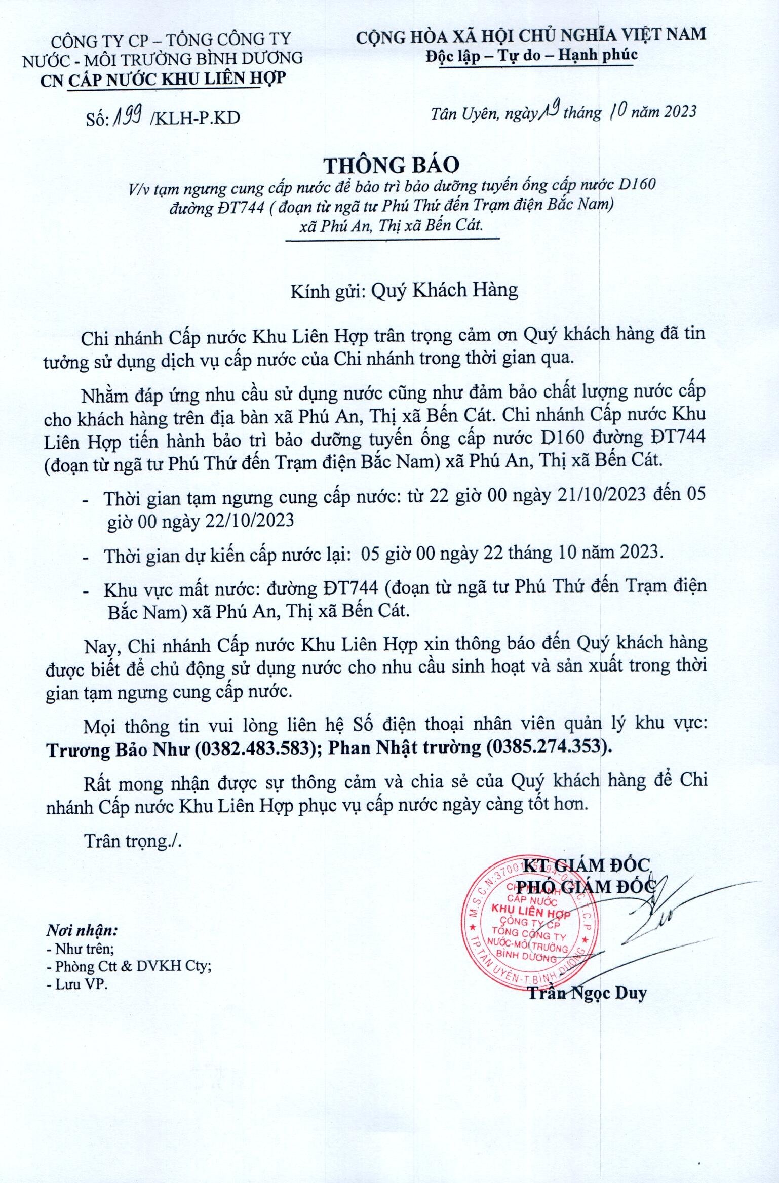 Tạm ngưng cung cấp nước khu vực KLH : Đường ĐT744 ( đoạn từ ngã tư Phú Thứ đến Trạm điện Bắc Nam), xã Phú An, Thị xã Bến Cát