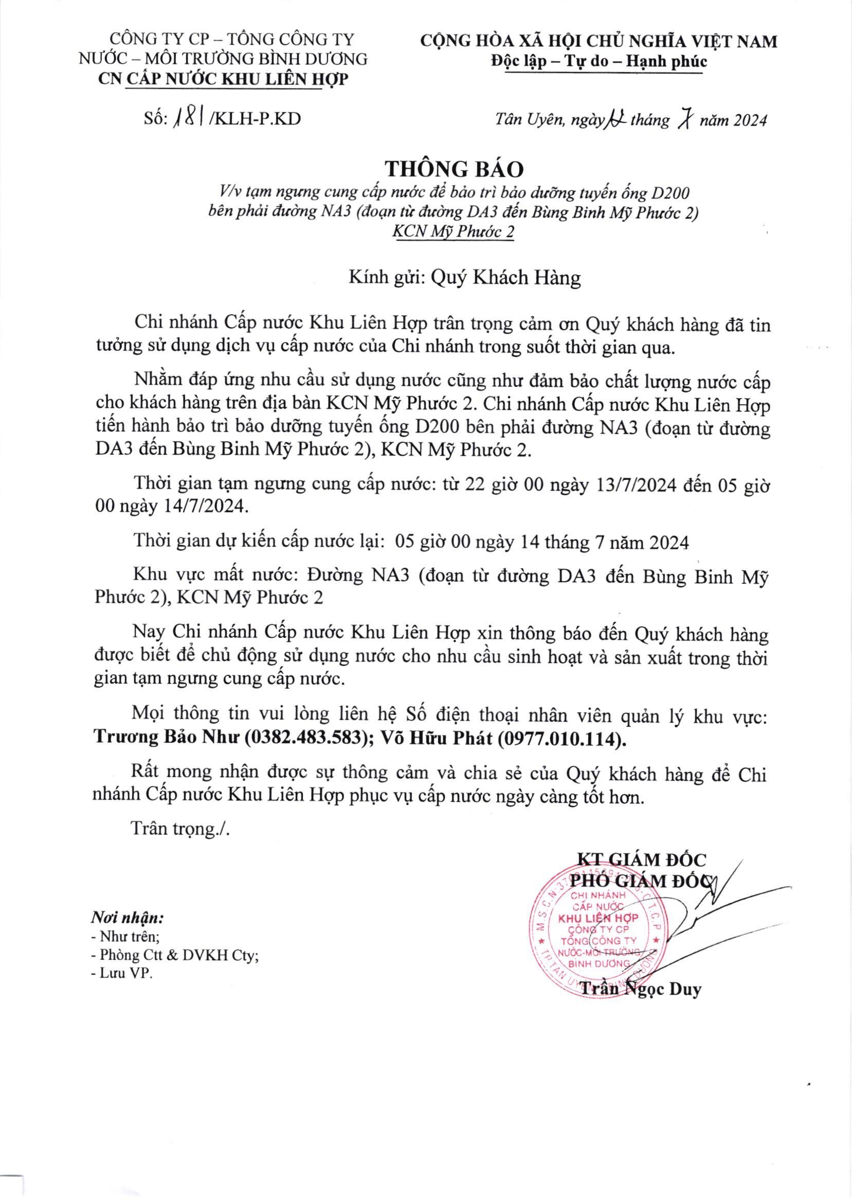 Tạm ngưng cung cấp nước khu vực KLH : Đường NA3 (đoạn từ đường DA3 đến Bùng Binh Mỹ Phước 2), KCN Mỹ Phước 2