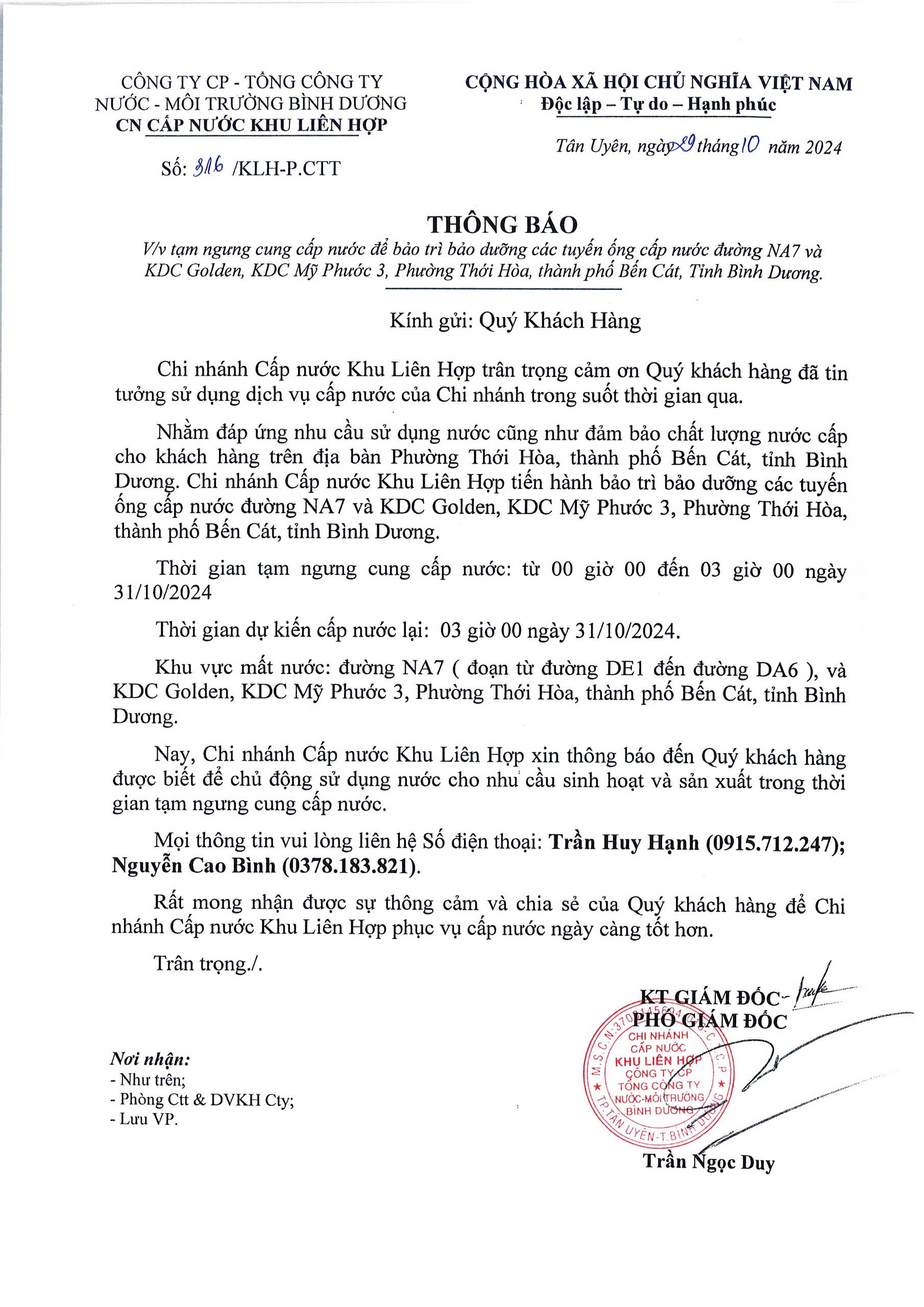 Tạm ngưng cung cấp nước khu vực KLH : Đường NA7 và KDC Golden, KDC Mỹ Phước 3, Phường Thới Hòa, TP. Bến Cát, Tỉnh Bình Dương