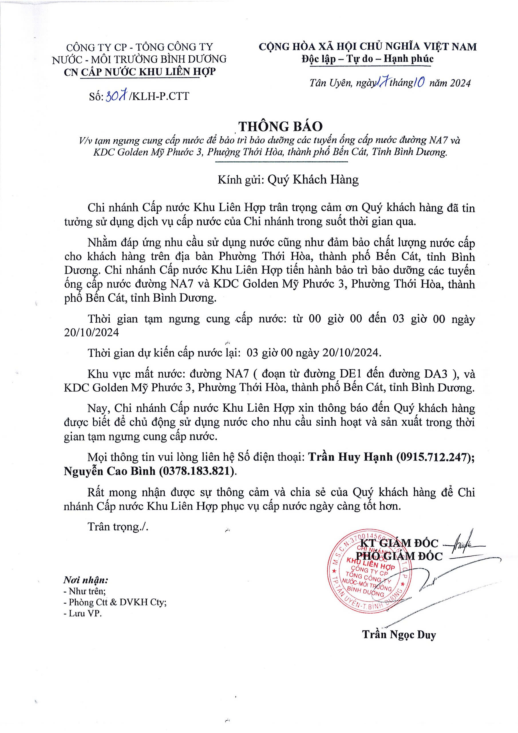 Tạm ngưng cung cấp nước khu vực KLH : Đường NA7 và KDC Golden Mỹ Phước 3, Phường Thới Hòa, TP. Bến Cát, Tỉnh Bình Dương