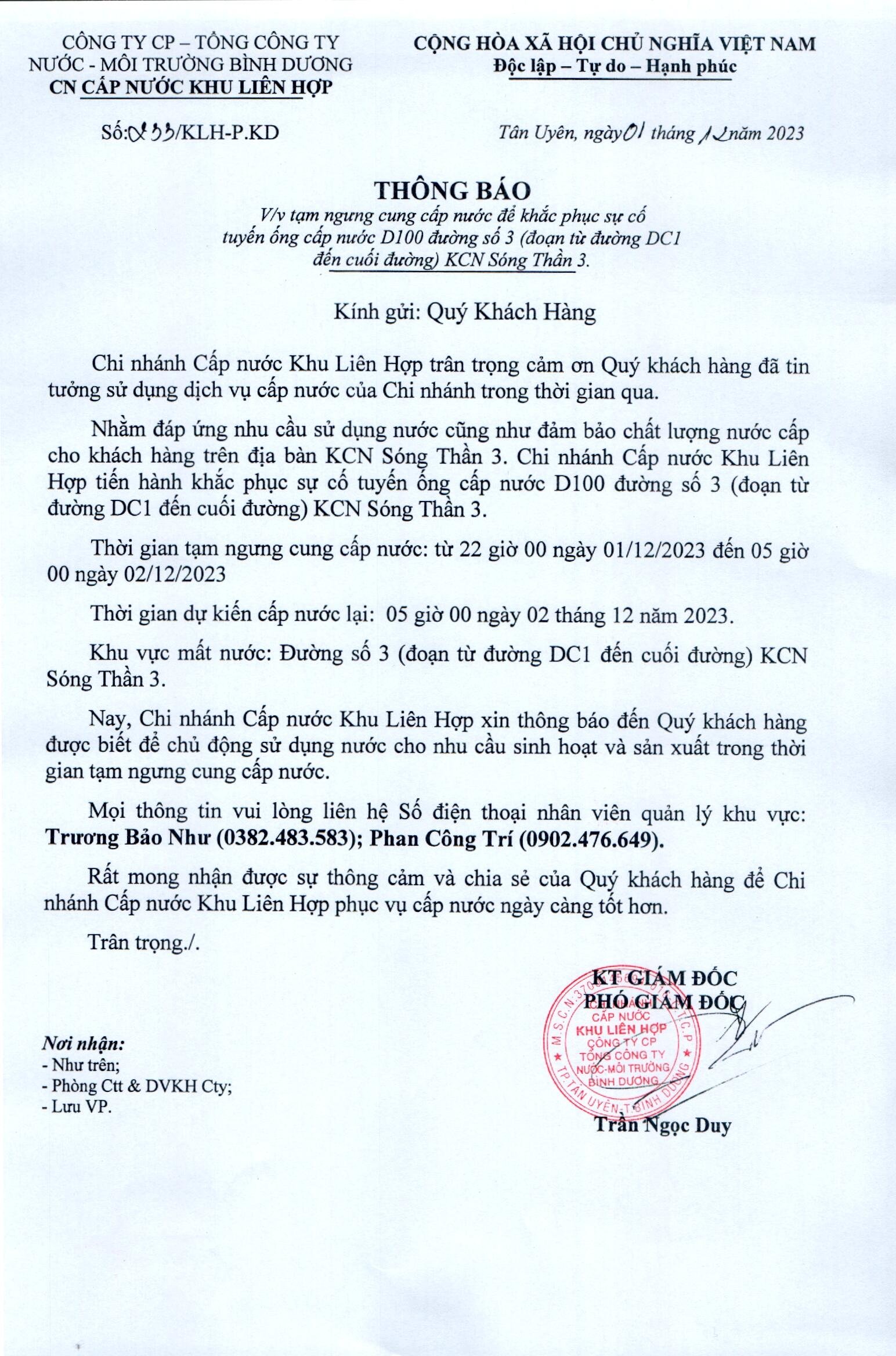 Tạm ngưng cung cấp nước khu vực KLH : Đường số 3 (đoạn từ đường DC1 đến cuối đường) KCN Sóng Thần 3