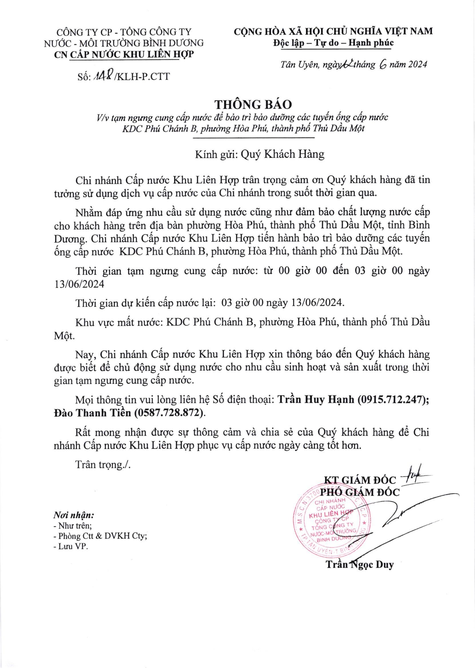 Tạm ngưng cung cấp nước khu vực KLH : KDC Phú Chánh B, Phường Hòa Phú, TP.TDM