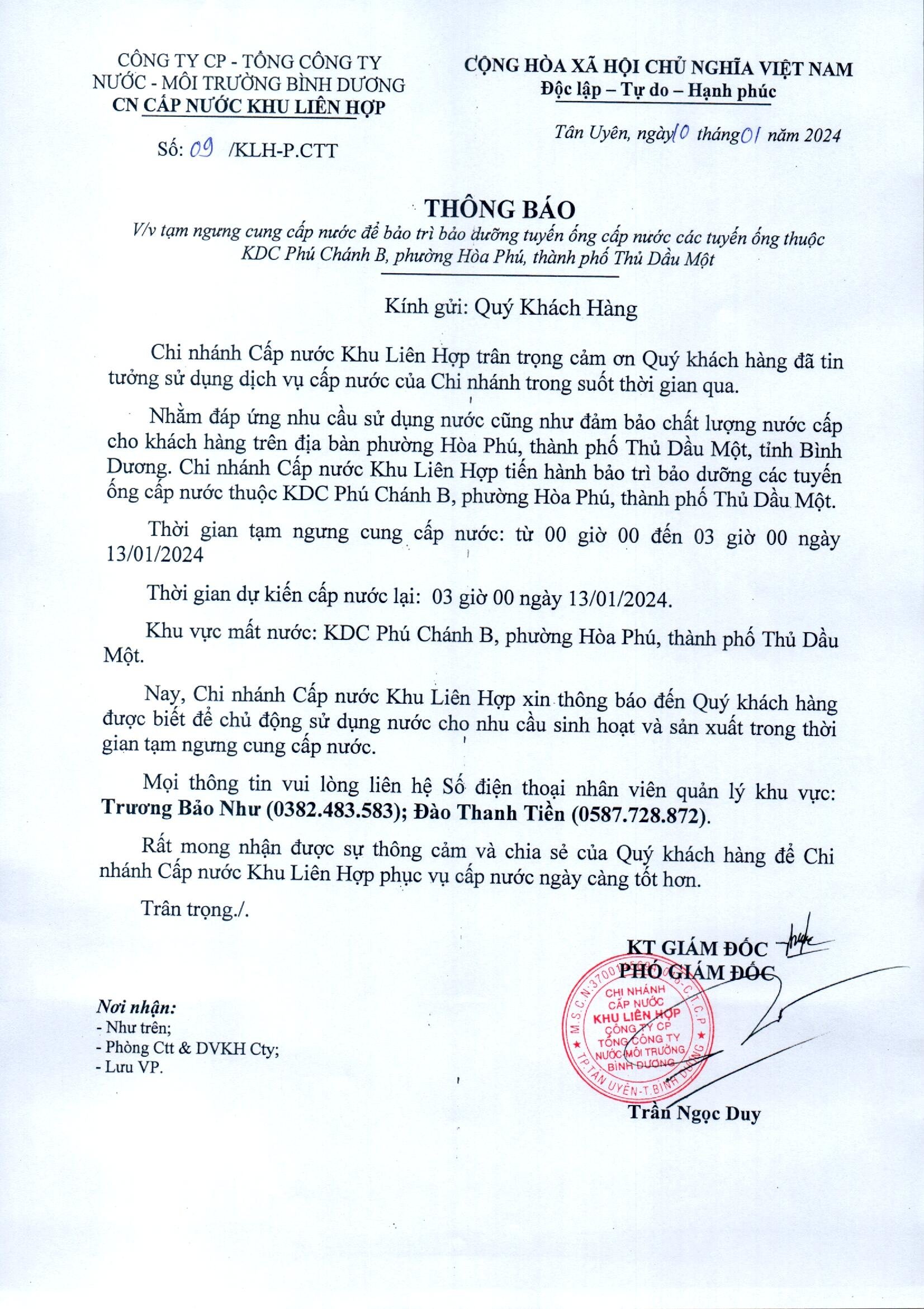 Tạm ngưng cung cấp nước khu vực KLH : KDC Phú Chánh B, Phường Hòa Phú, Thành phố Thủ Dầu Một, Bình Dương