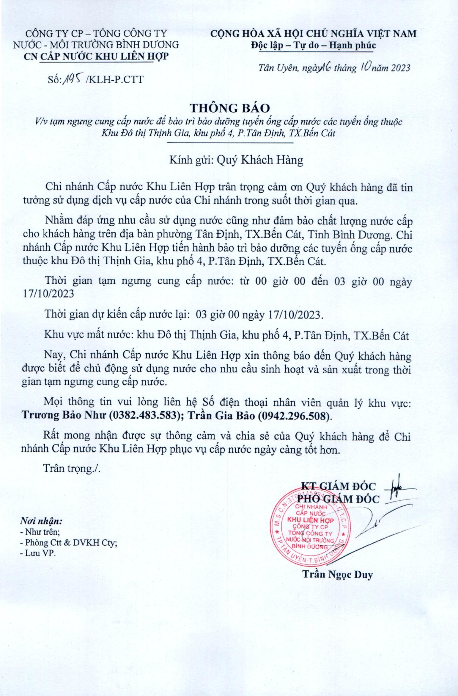 Tạm ngưng cung cấp nước khu vực KLH : Khu Đô thị Thịnh Gia, khu phố 4, Phường Tân Định, TX. Bến Cát