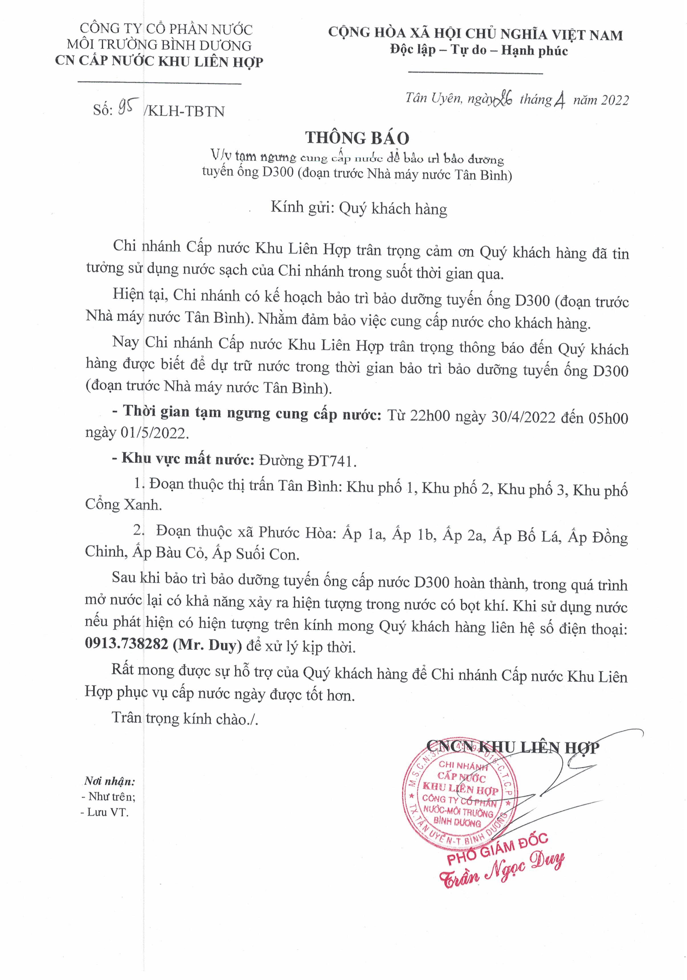 Tạm ngưng cấp nước khu vực Khu Liên Hợp: tuyến ống D150 bên phải đường Đại Lộ Bình Dương (đoạn từ...