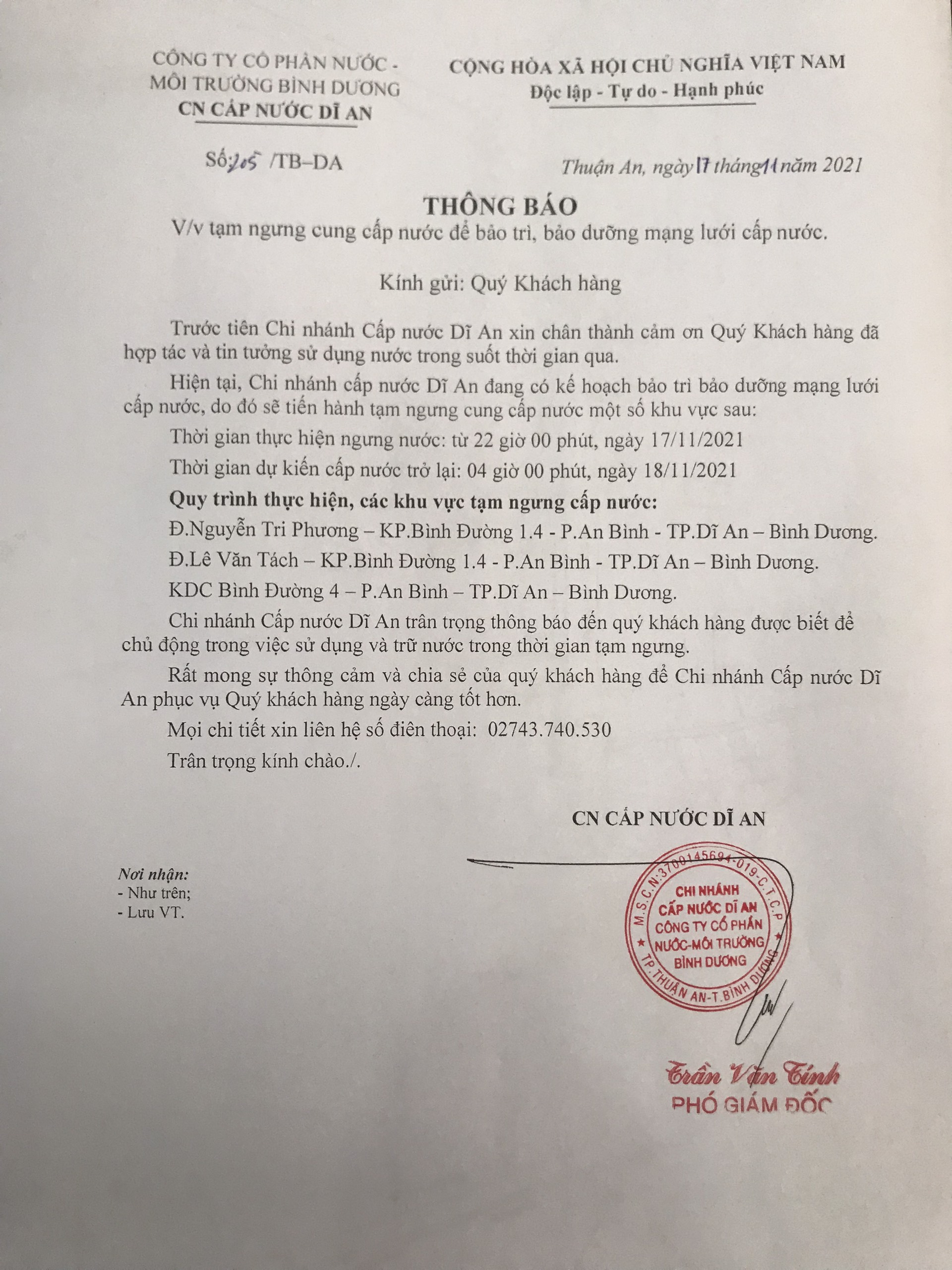 Tạm ngưng cấp nước khu vực Dĩ An: mạng lưới cấp nước tuyến ống D200 P. Tân Phước Khánh và P. An Phú