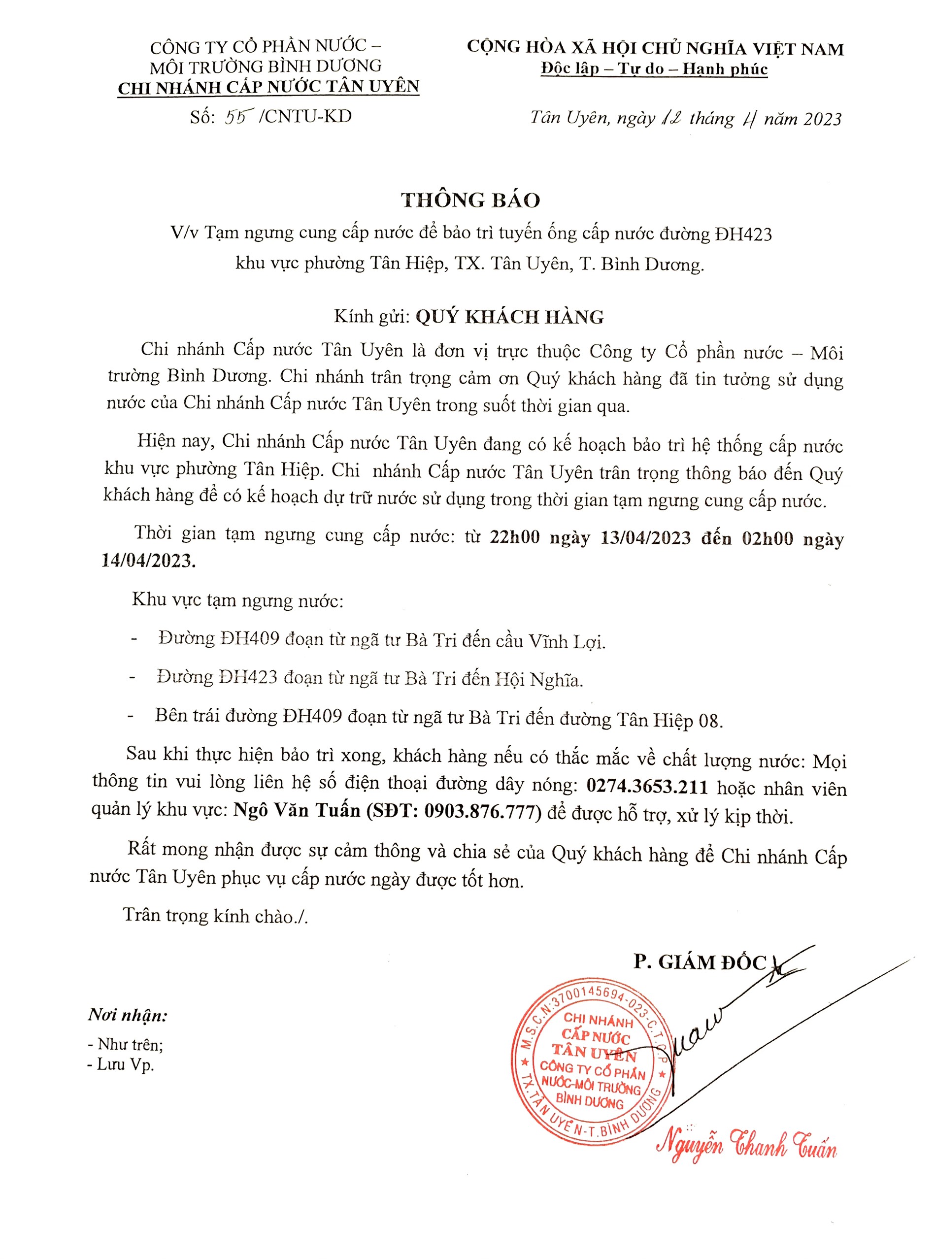 Tạm ngưng cấp nước khu vực Thuận An: tuyến ống cấp nước D400 đường Quốc Lộ 13, P.Bình Hòa