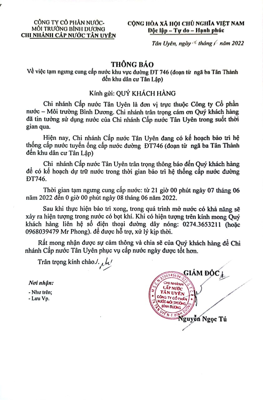 Tạm ngưng cấp nước khu vực Khu Liên Hợp: tuyến ống D150 bên phải đường Đại Lộ Bình Dương (đoạn từ...