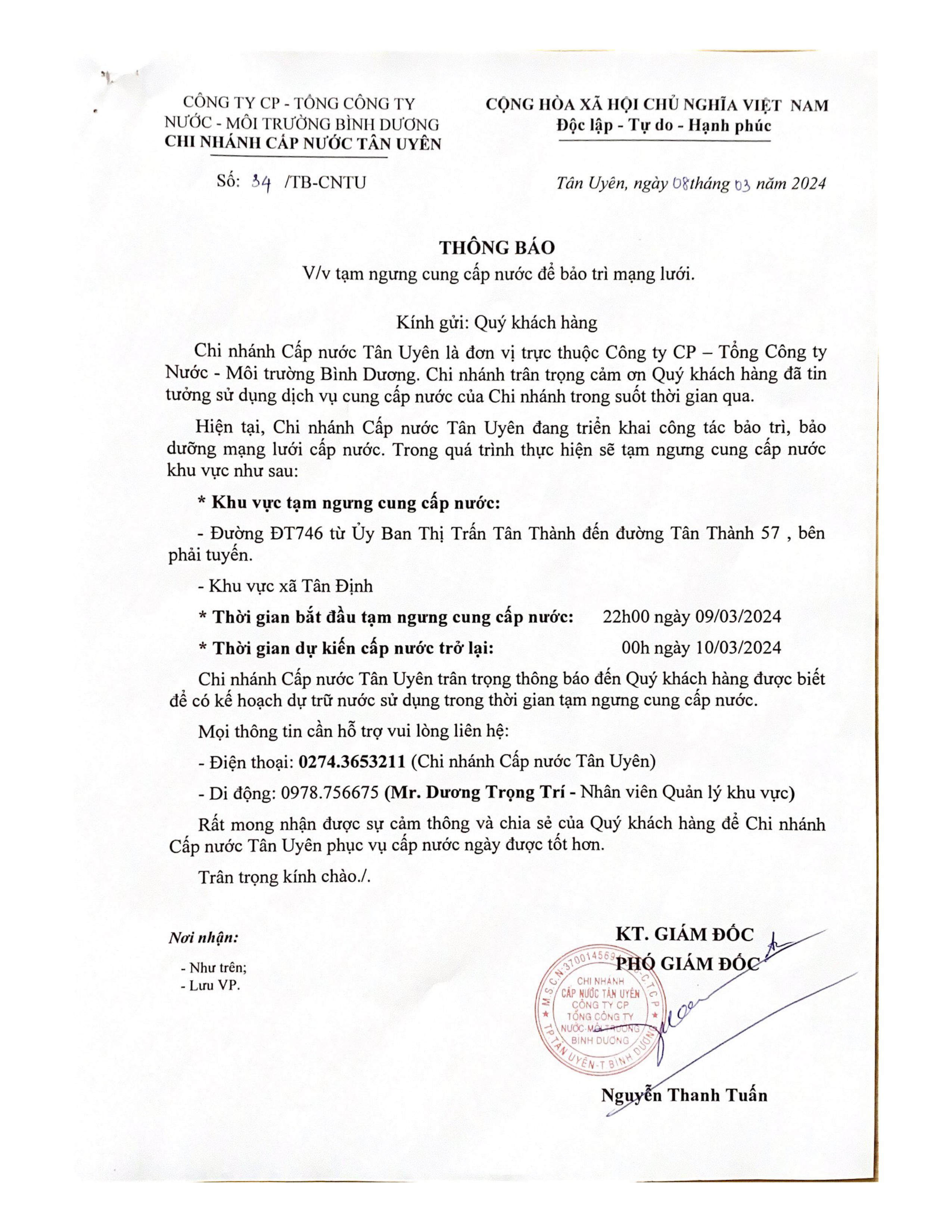 Tạm ngưng cung cấp nước khu vực Tân Uyên : Đường ĐT746 từ Ủy Ban Thị Trấn Tân Thành đến đường Tân Thành 57, bên phải tuyến - Khu vực xã Tân Định