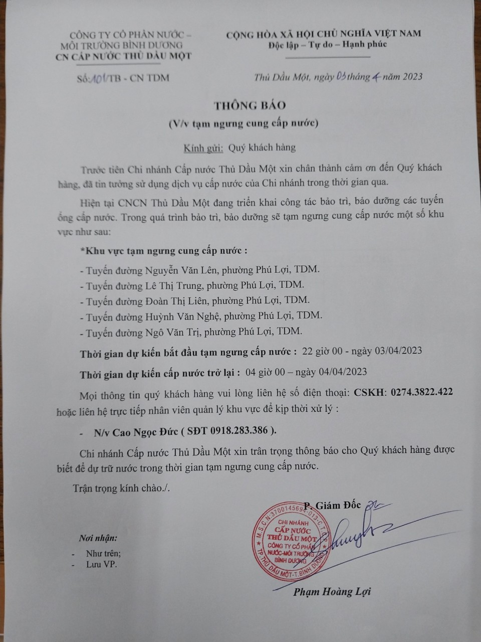 Tạm ngưng cấp nước khu vực Khu Liên Hợp: tuyến ống cấp nước D200 bên trái đường Đại lộ Bình Dương...