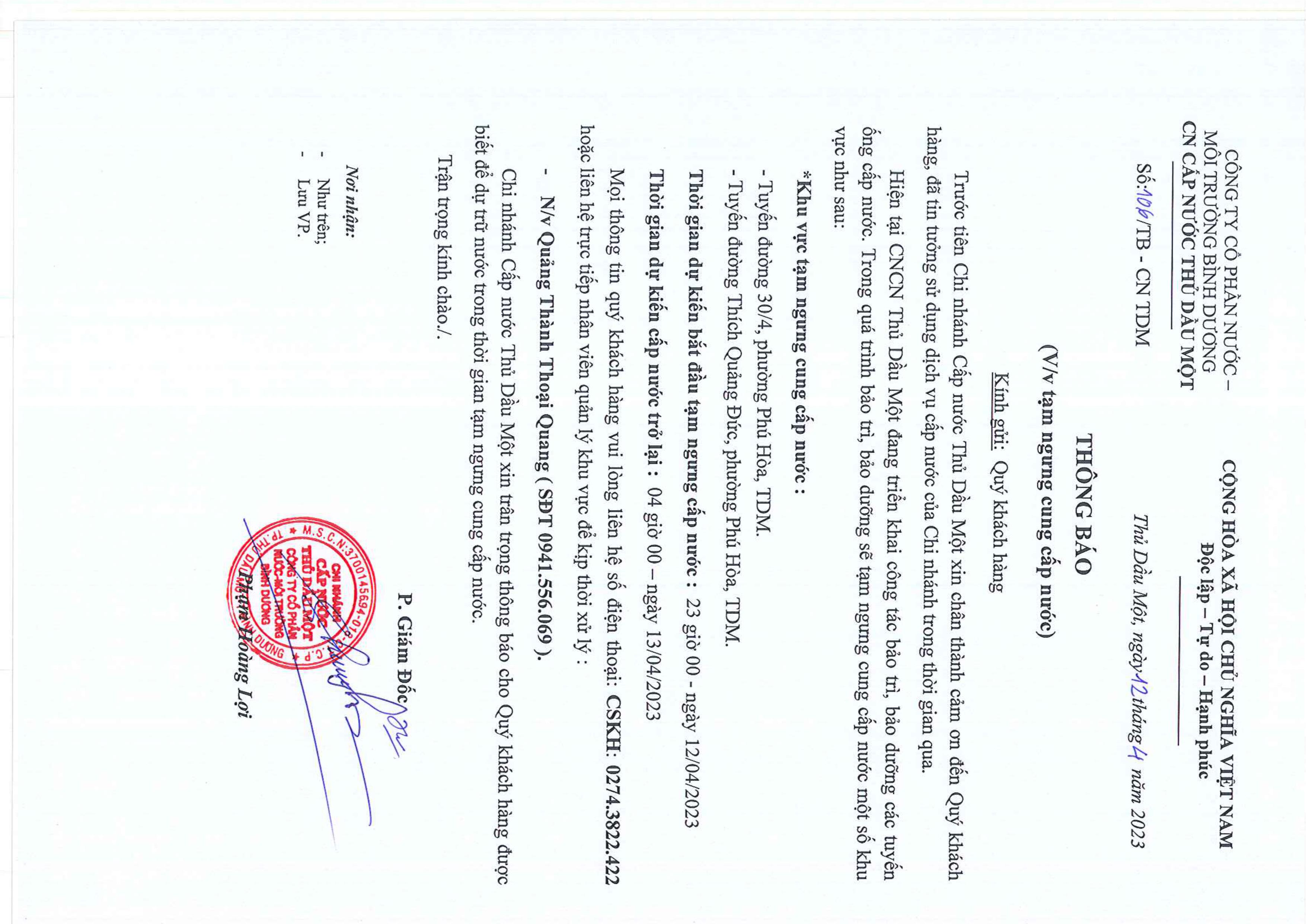 Tạm ngưng cấp nước khu vực Khu Liên Hợp: tuyến ống cấp nước D200 bên trái đường Đại lộ Bình Dương...