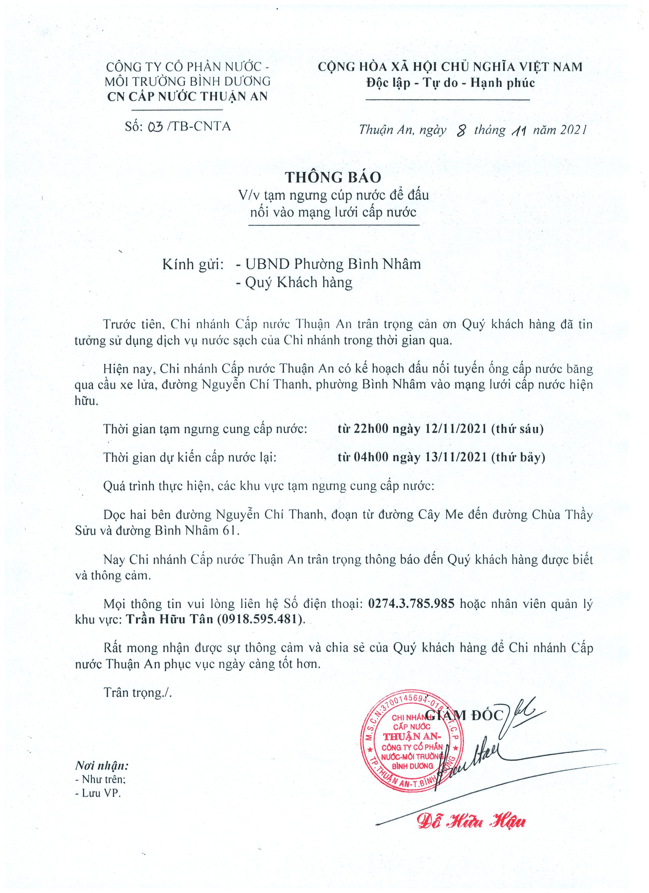 Tạm ngưng cấp nước khu vực Thuận An: tuyến ống cấp nước D400 đường Quốc Lộ 13, P.Bình Hòa